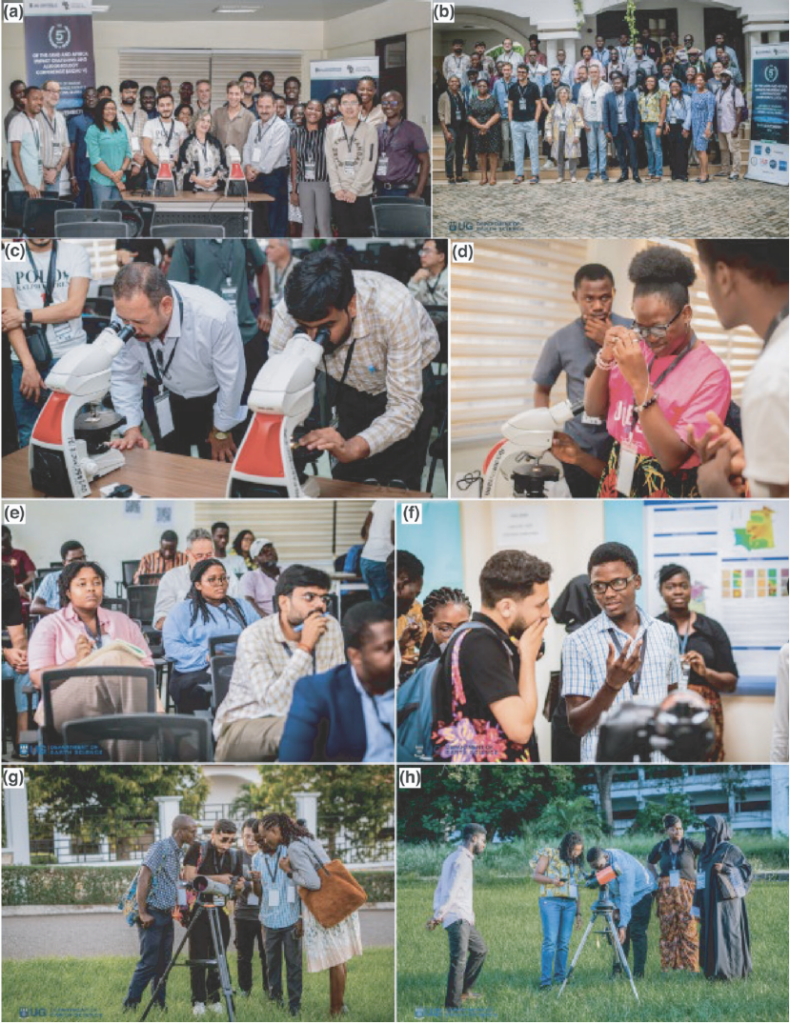Images prises lors de l’atelier préliminaire et de la conférence, montrant (a, b) des photos de groupe des participants à l’atelier et à la conférence, respectivement ; (c, d) des participants à l’atelier en train de réaliser des activités pratiques ; (e, f) un échantillon des participants lors d’une séance d’exposés oraux et aux expositions, respectivement ; (g, h) des participants à la soirée d’observation du ciel. Crédits photos : Département des sciences de la Terre, Université du Ghana.