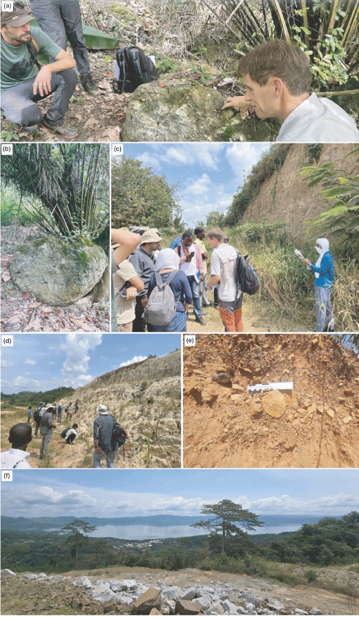 Excursion sur le terrain après la conférence : (a) bloc de suévite à environ 1 500 m au nord du bord du cratère, (b) bloc de suévite, même emplacement que (a), (c) affleurement de brèche d’impact mis à nu par une tranchée routière, situé à l’est du cratère, au sommet du bord du cratère, (d) coupe routière exposant des métasédiments du Supergroupe du Birimien, située sur le bord du cratère vers l’entrée nord-ouest de celui-ci, (e) brèche altérée de métasédiments du Birimien située à environ 10 km du centre du cratère, à la lisière des dépôts d’éjectas, (f) vue d’ensemble du cratère d’impact de Bosumtwi depuis le nord-ouest, au sommet du bord du cratère, en regardant vers le nord-est. Crédits photos : (a, c, d) Myriam Telus, (b) Cheikh Ahmadou Bamba Niang, (e) Wassim Fitouri, (f) Marian Selorm Sapah.
