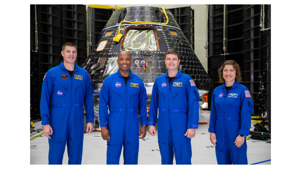 L’équipage de la mission Artemis II devant le vaisseau Orion. De gauche à droite : Jeremy Hansen ; Victor J. Glover, pilote ; Gregory Reid Wiseman, commandant ; et Christina Koch. (Crédit : Nasa) (https://www.nasa.gov/feature/our-artemis-crew/)