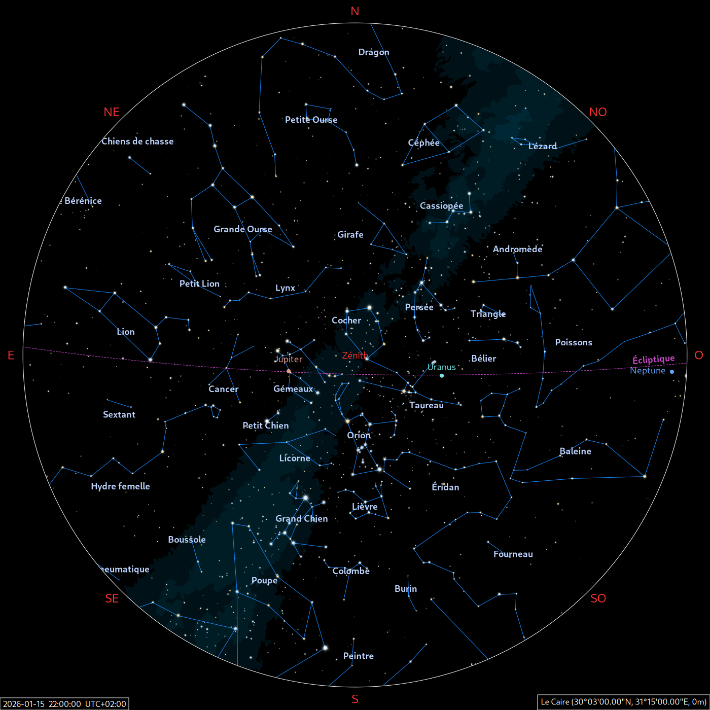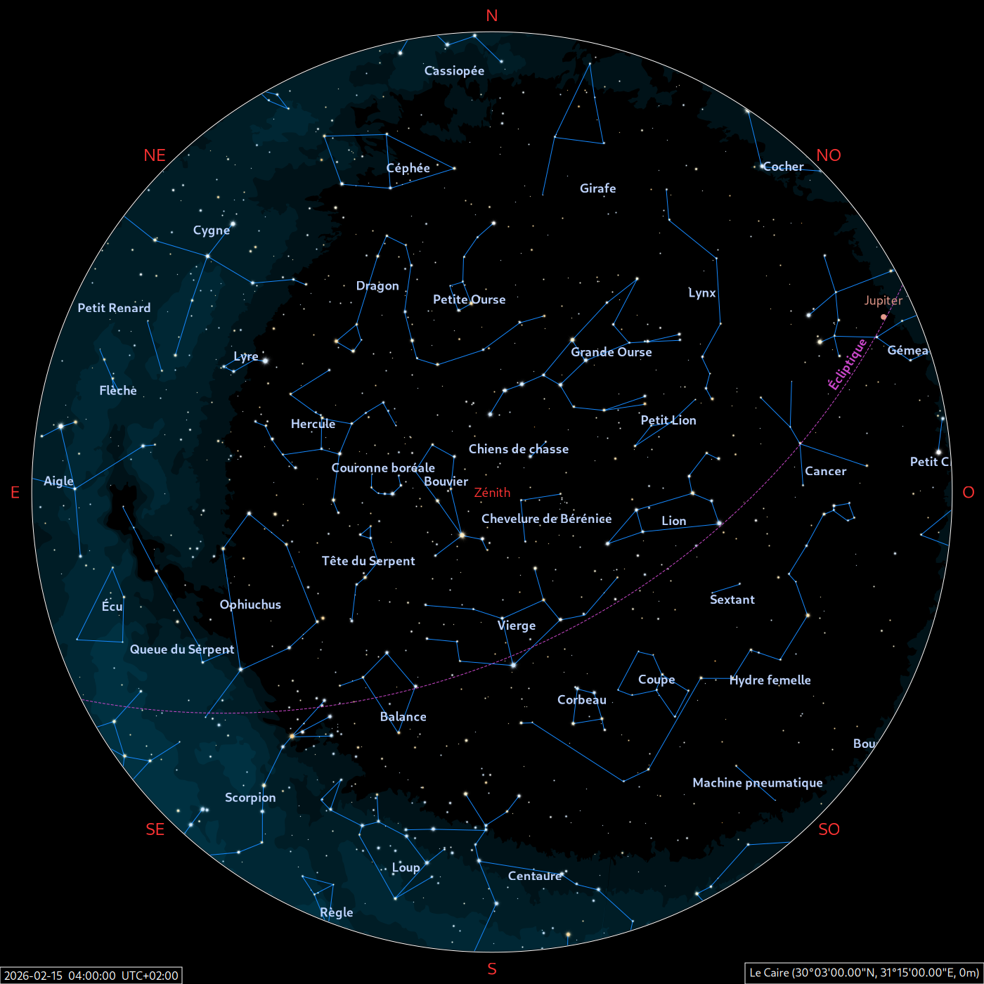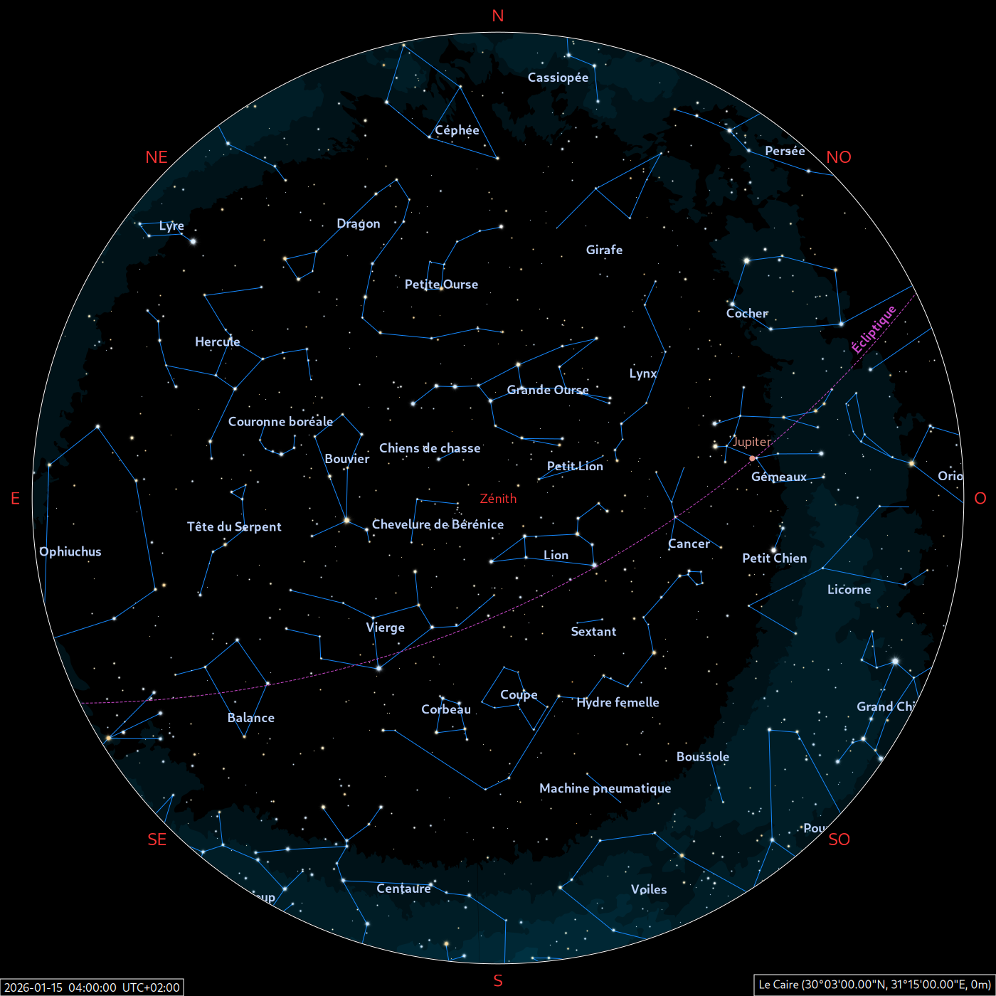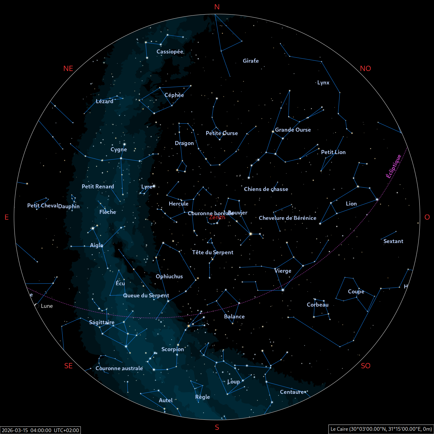 Les cartes du ciel ci-dessous (réalisées par l’IMCCE) montrent le ciel visible à 22h et à 4h du mois indiqué. Elles sont valables dans le tout le pays avec quelques ajustements selon la latitude.
