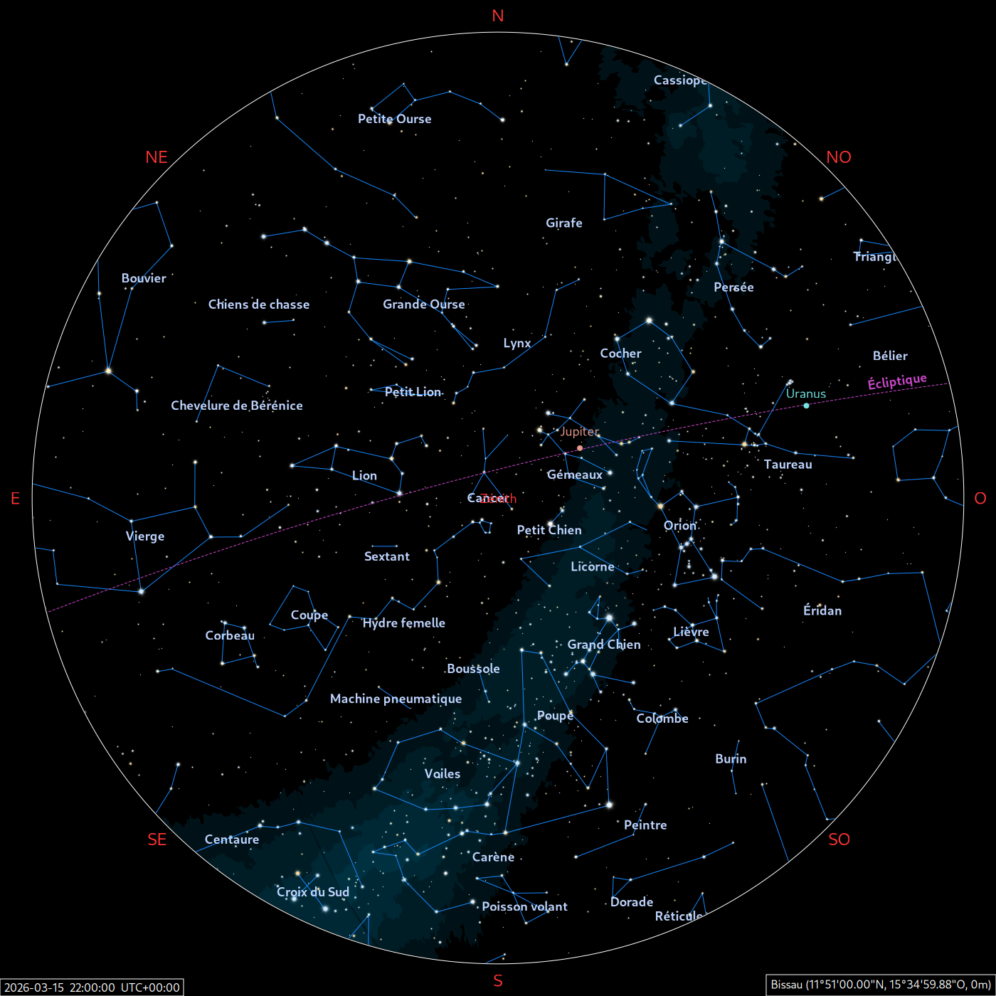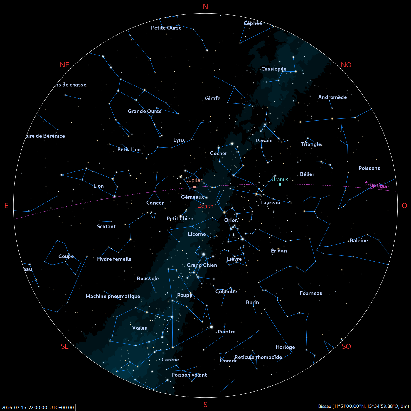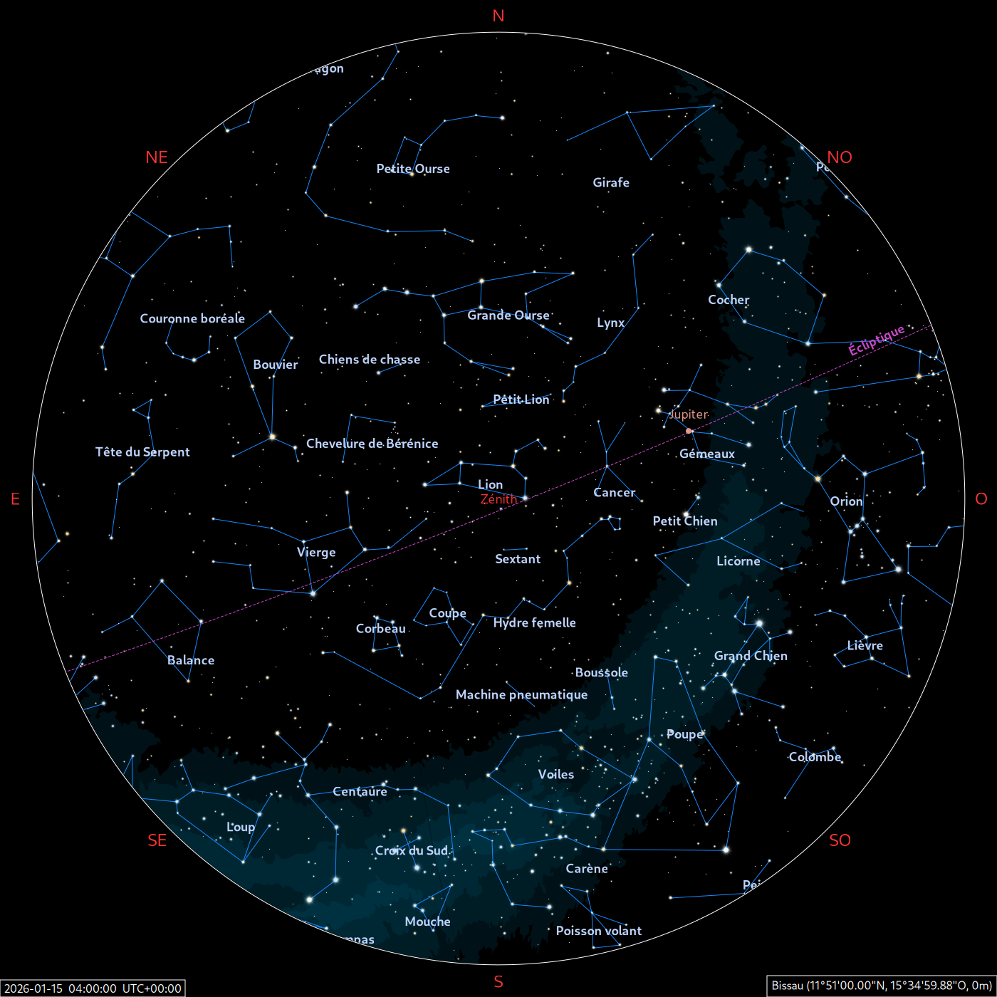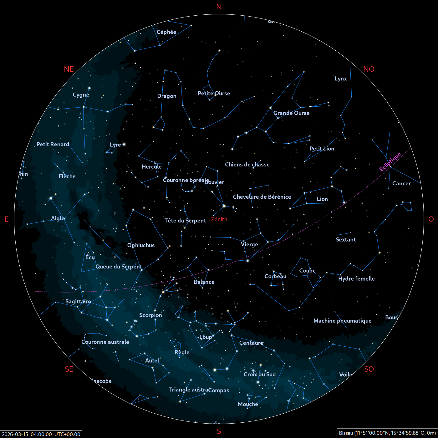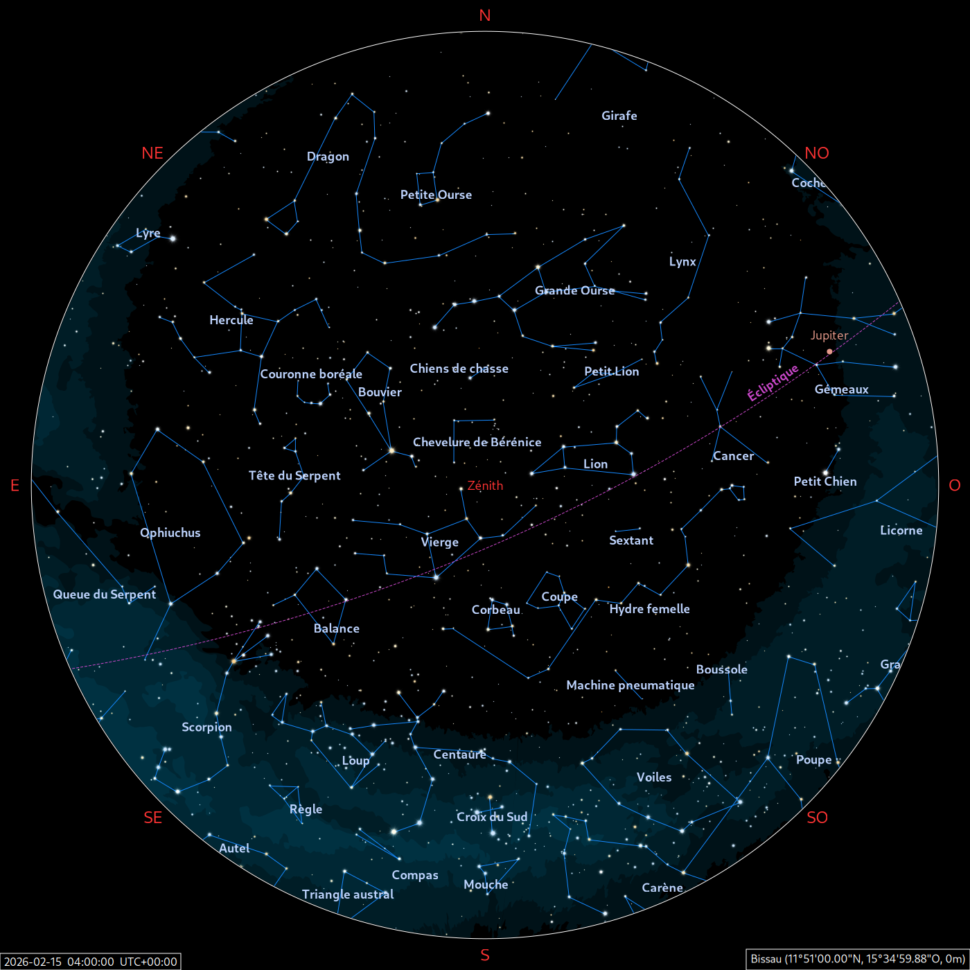 Les cartes du ciel ci-dessous (réalisées par l’IMCCE) montrent le ciel visible à 22h et à 4h du mois indiqué. Elles sont valables dans le tout le pays avec quelques ajustements selon la latitude.