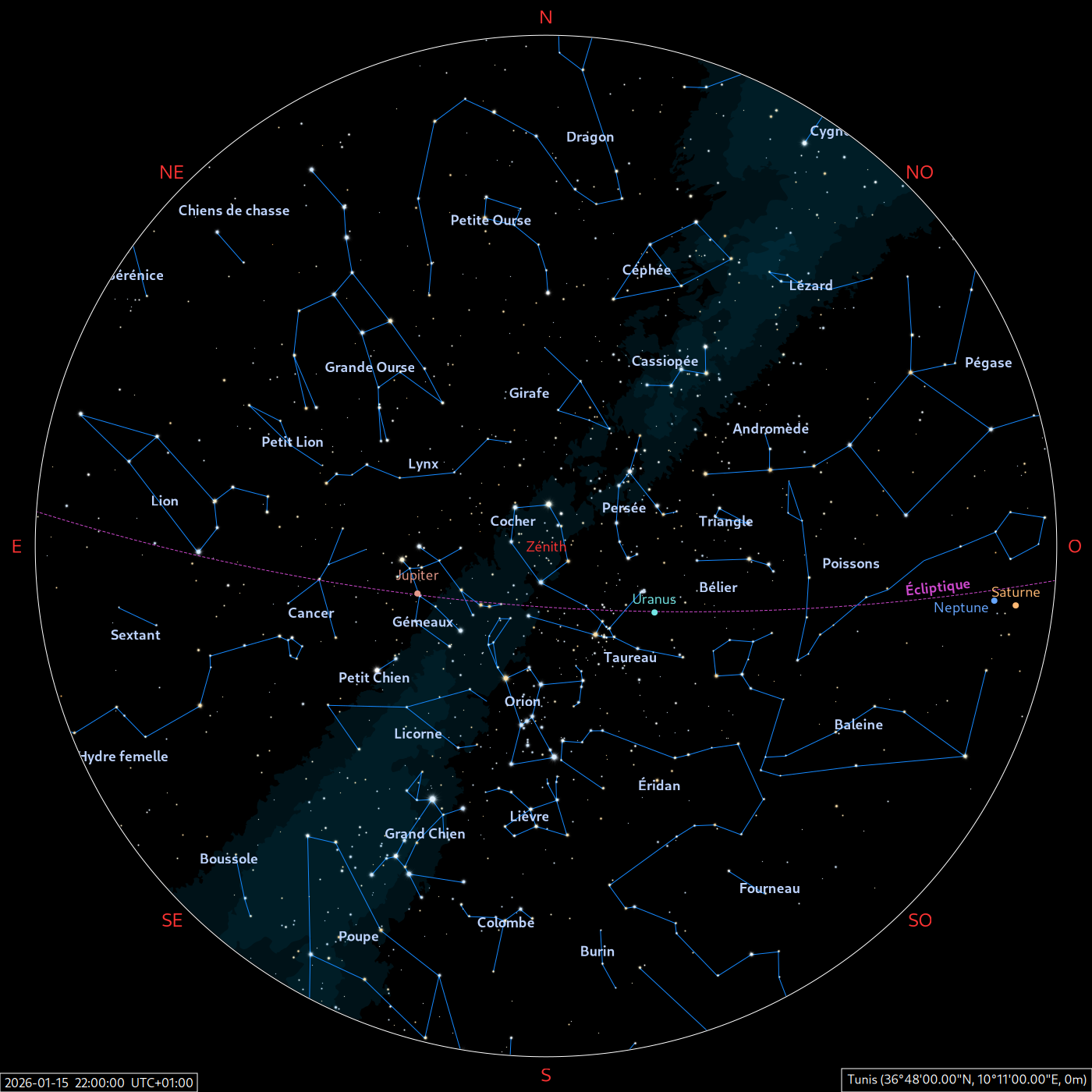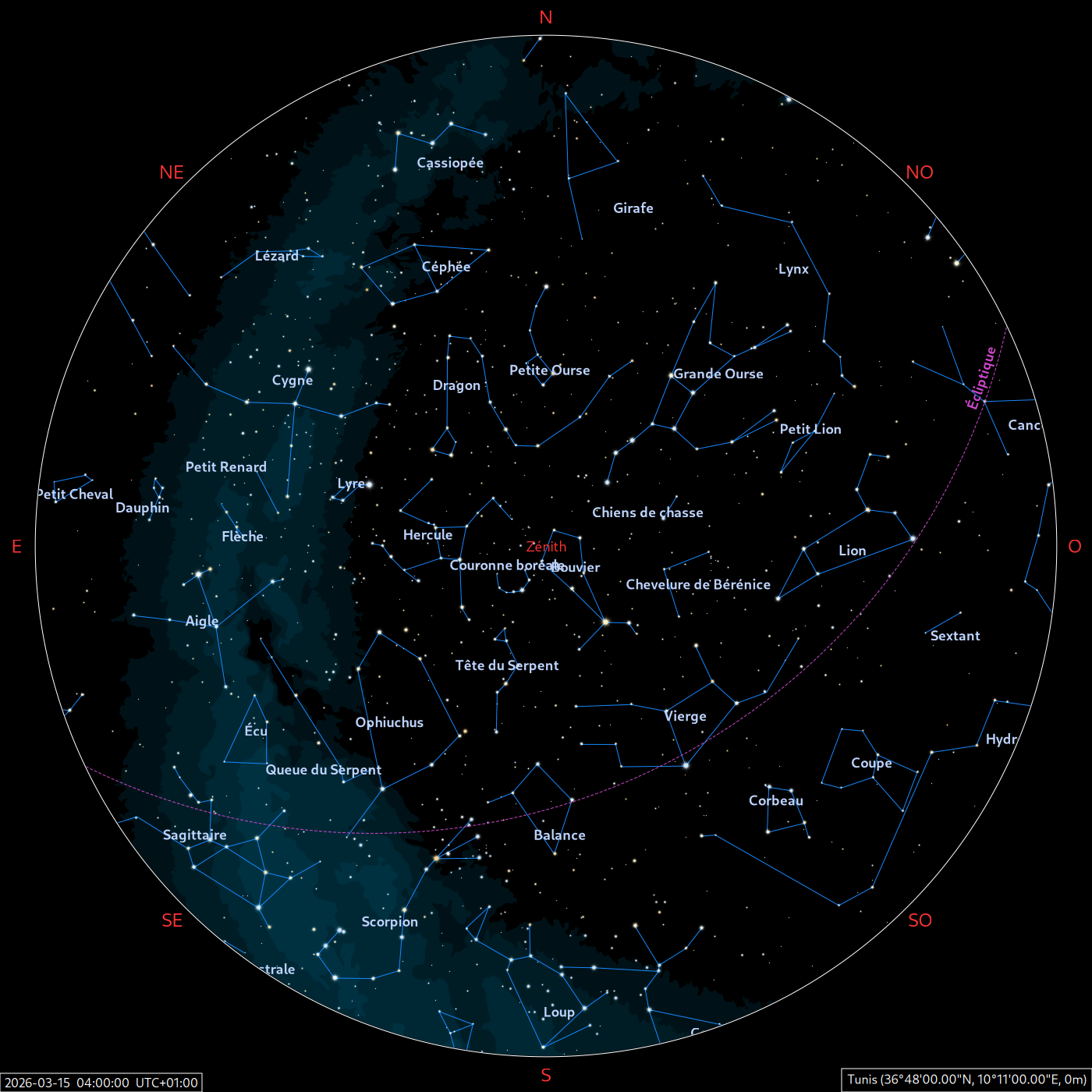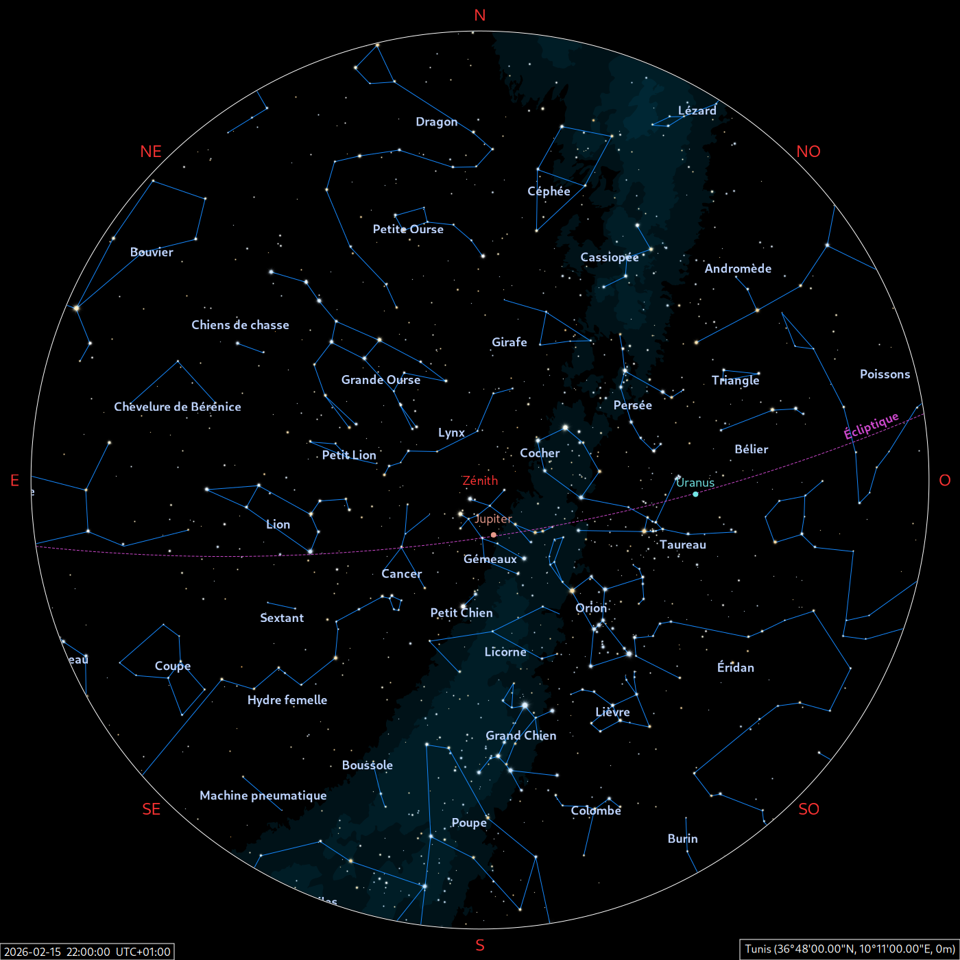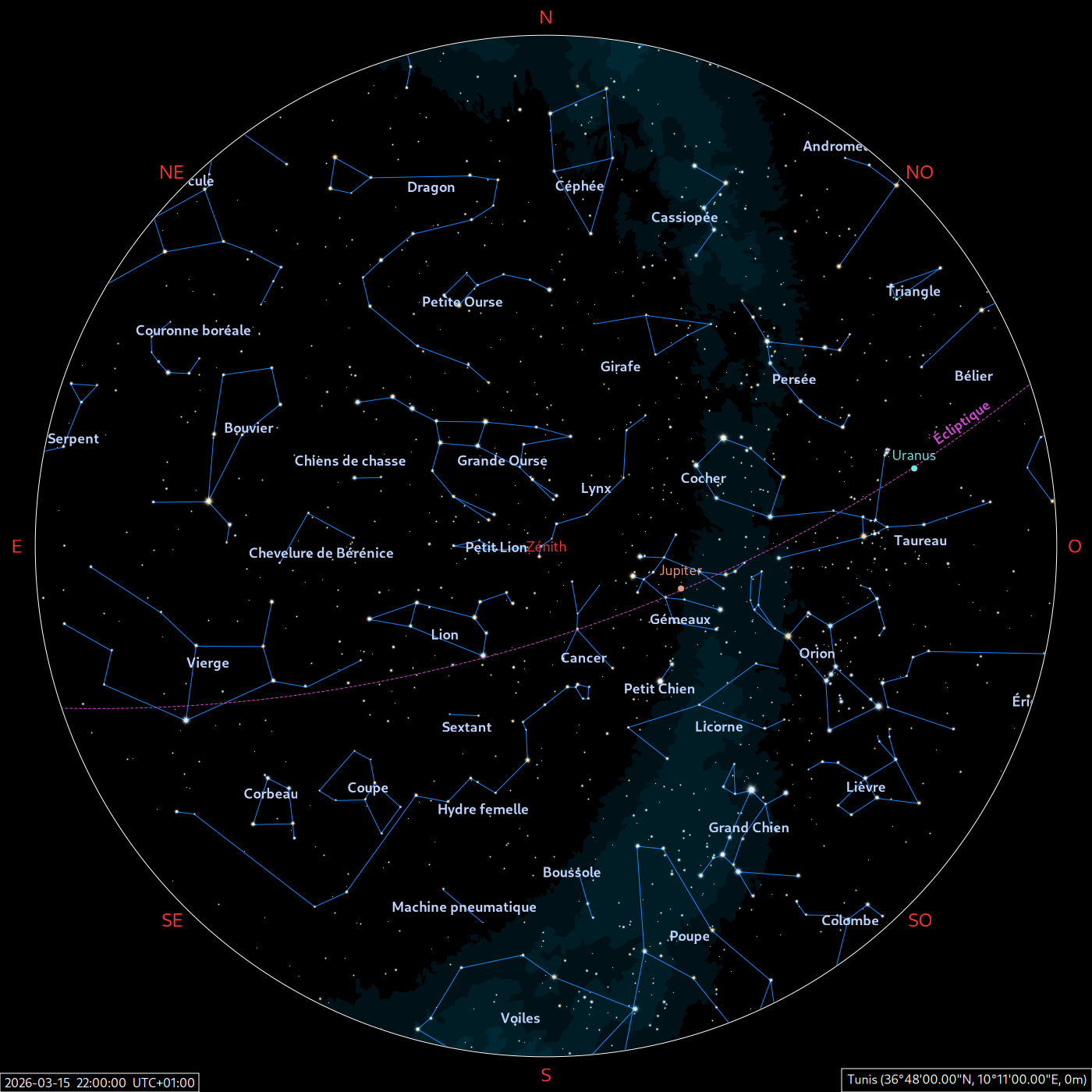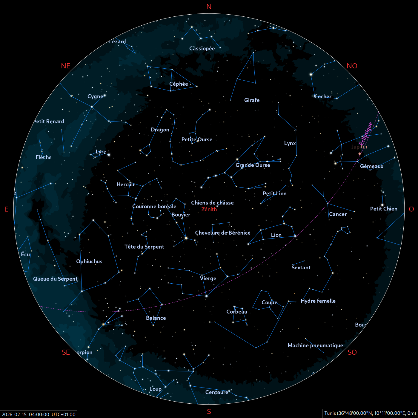 Les cartes du ciel ci-dessous (réalisées par l’IMCCE) montrent le ciel visible à 22h et à 4h du mois indiqué. Elles sont valables dans le tout le pays avec quelques ajustements selon la latitude.