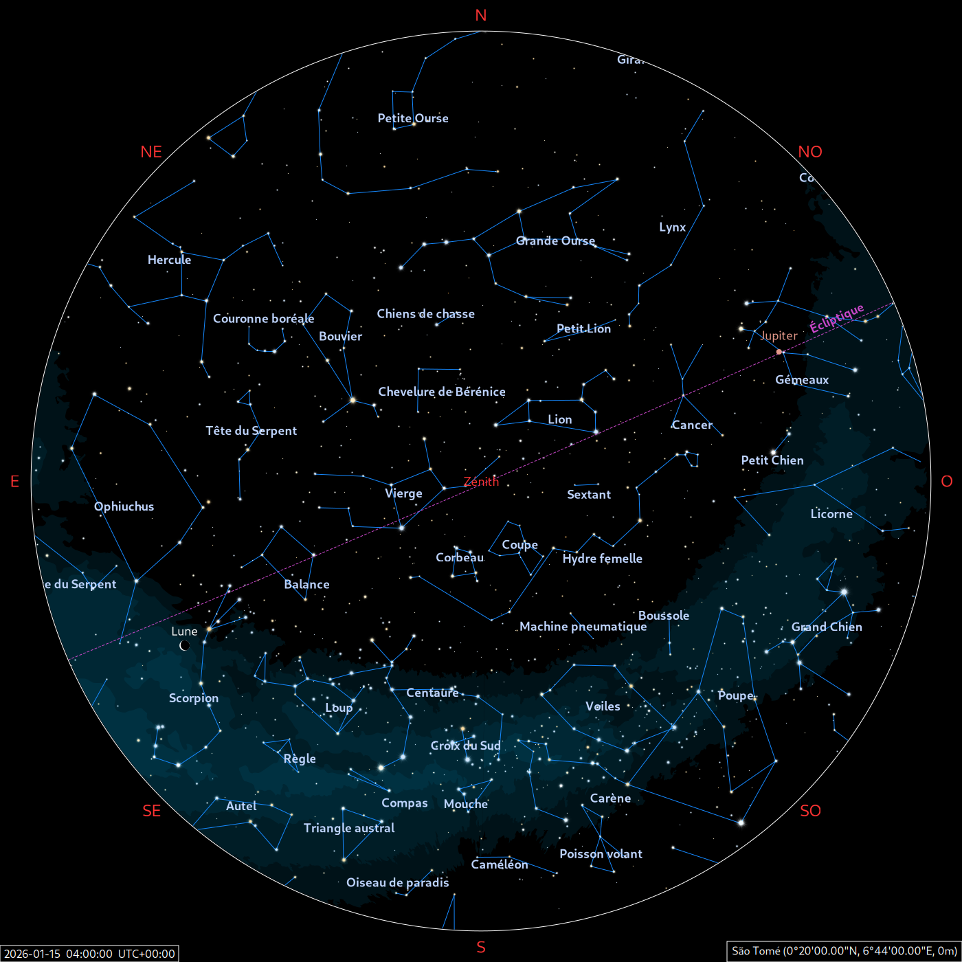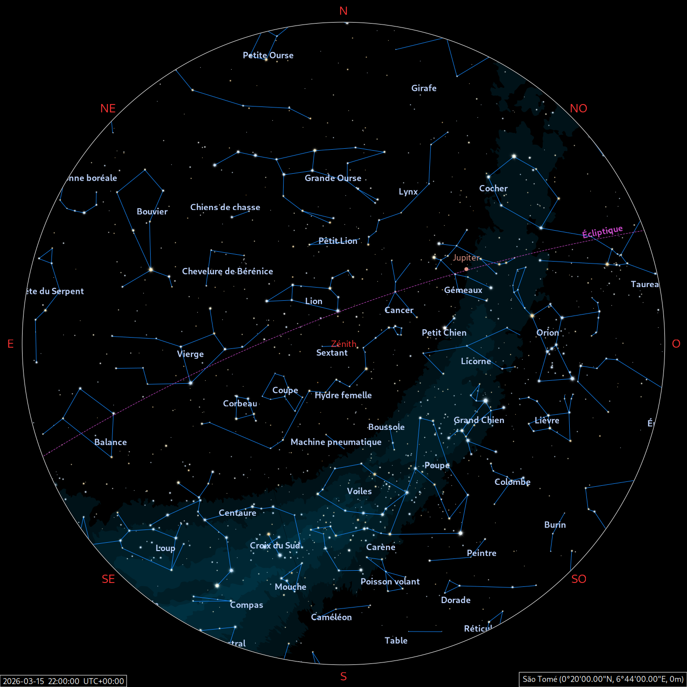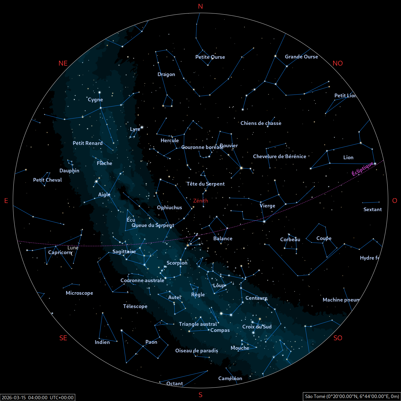 Les cartes du ciel ci-dessous (réalisées par l’IMCCE) montrent le ciel visible à 22h et à 4h du mois indiqué. Elles sont valables dans le tout le pays avec quelques ajustements selon la latitude.