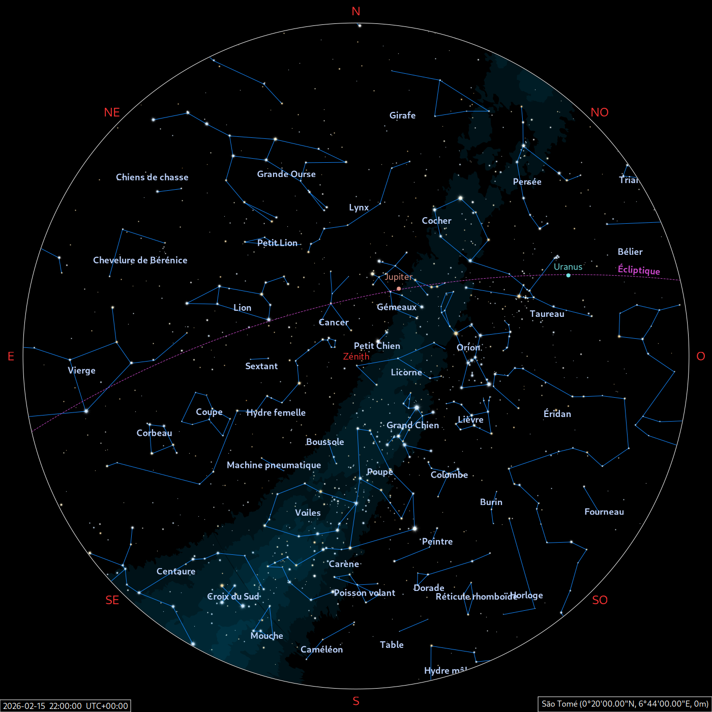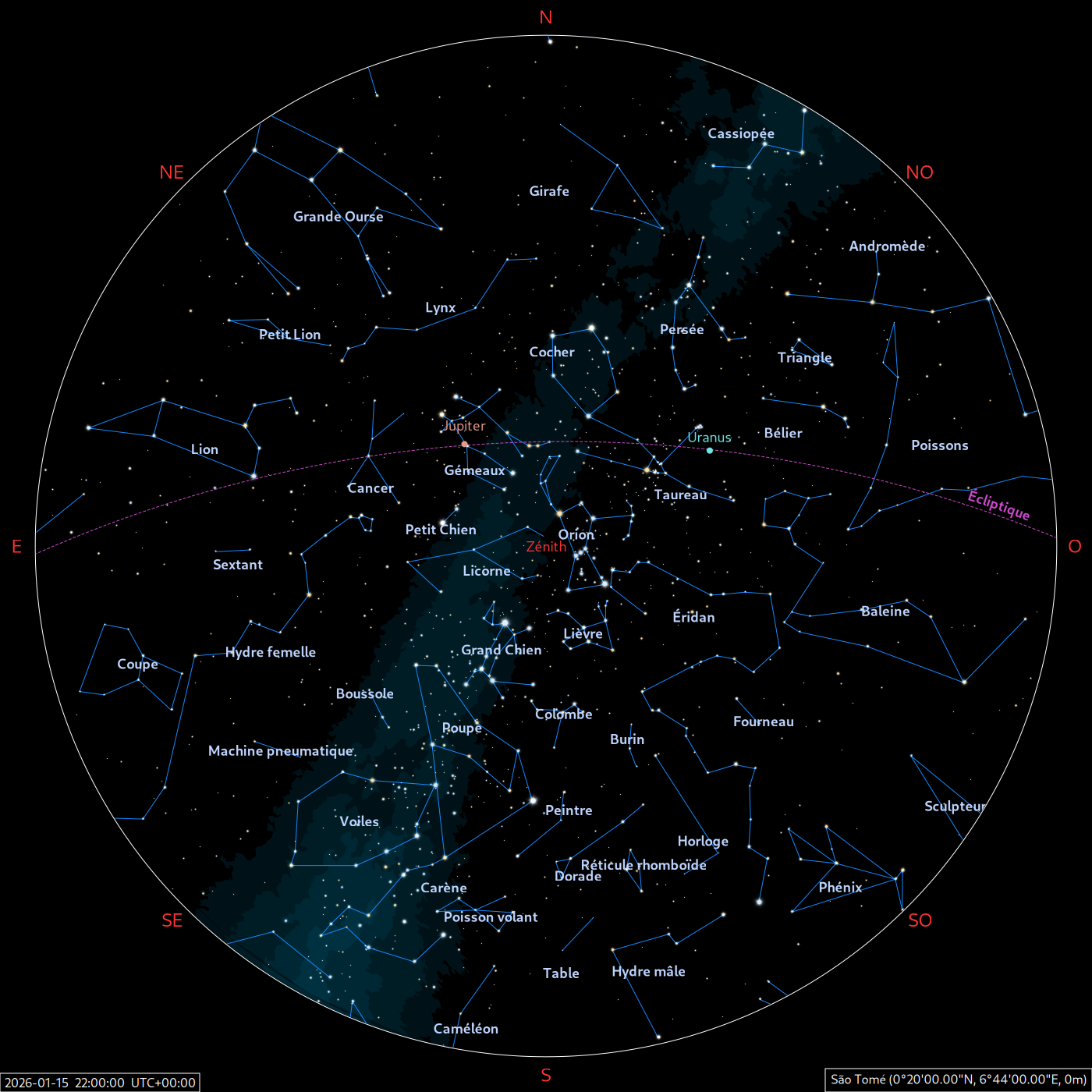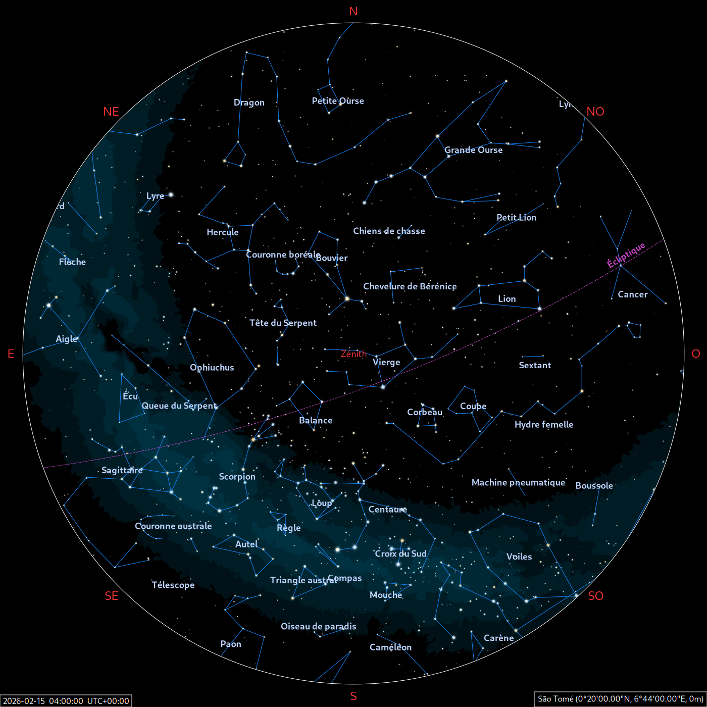 Les cartes du ciel ci-dessous (réalisées par l’IMCCE) montrent le ciel visible à 22h et à 4h du mois indiqué. Elles sont valables dans le tout le pays avec quelques ajustements selon la latitude.