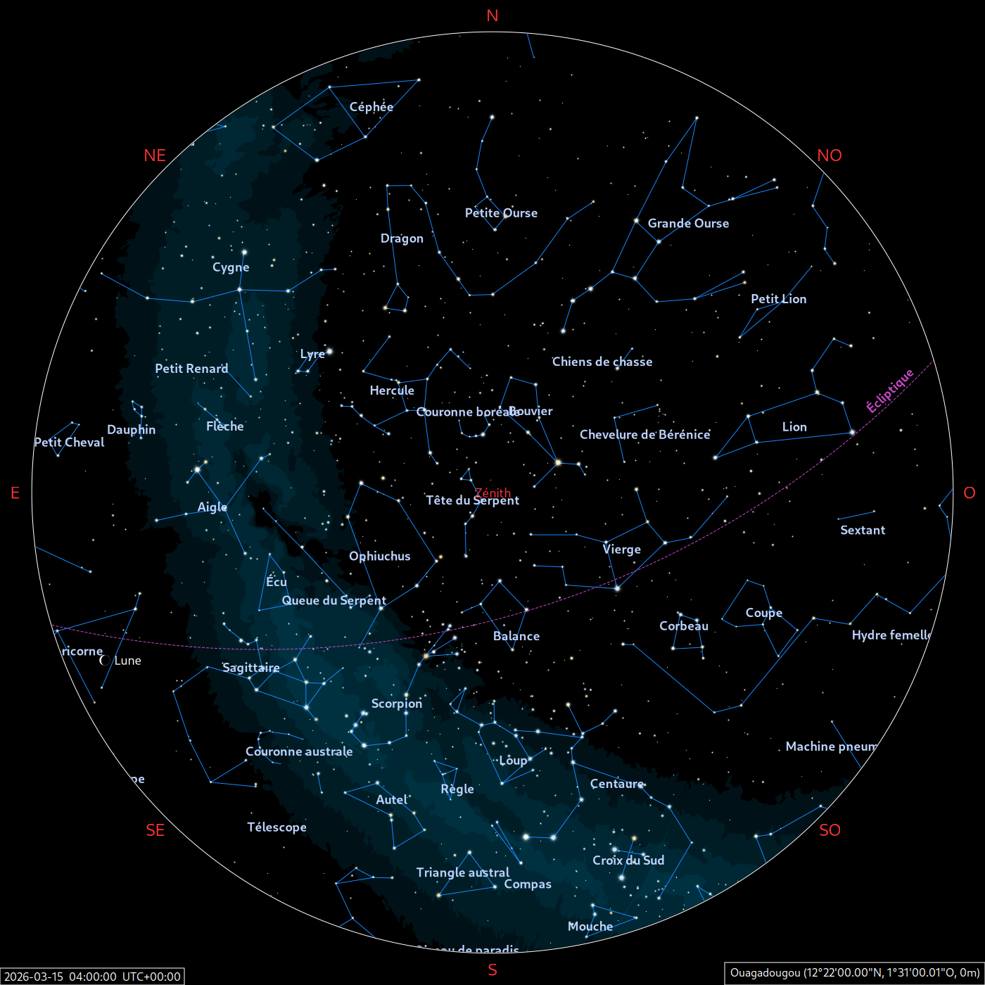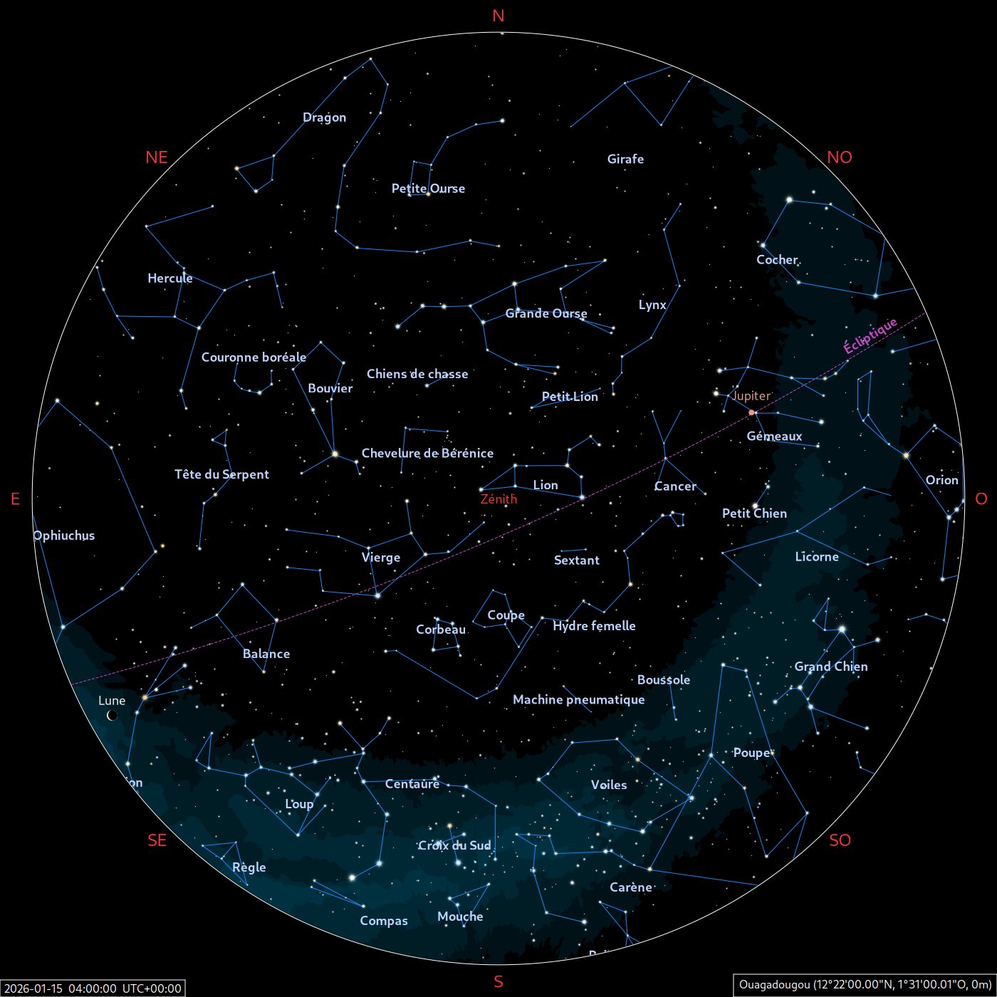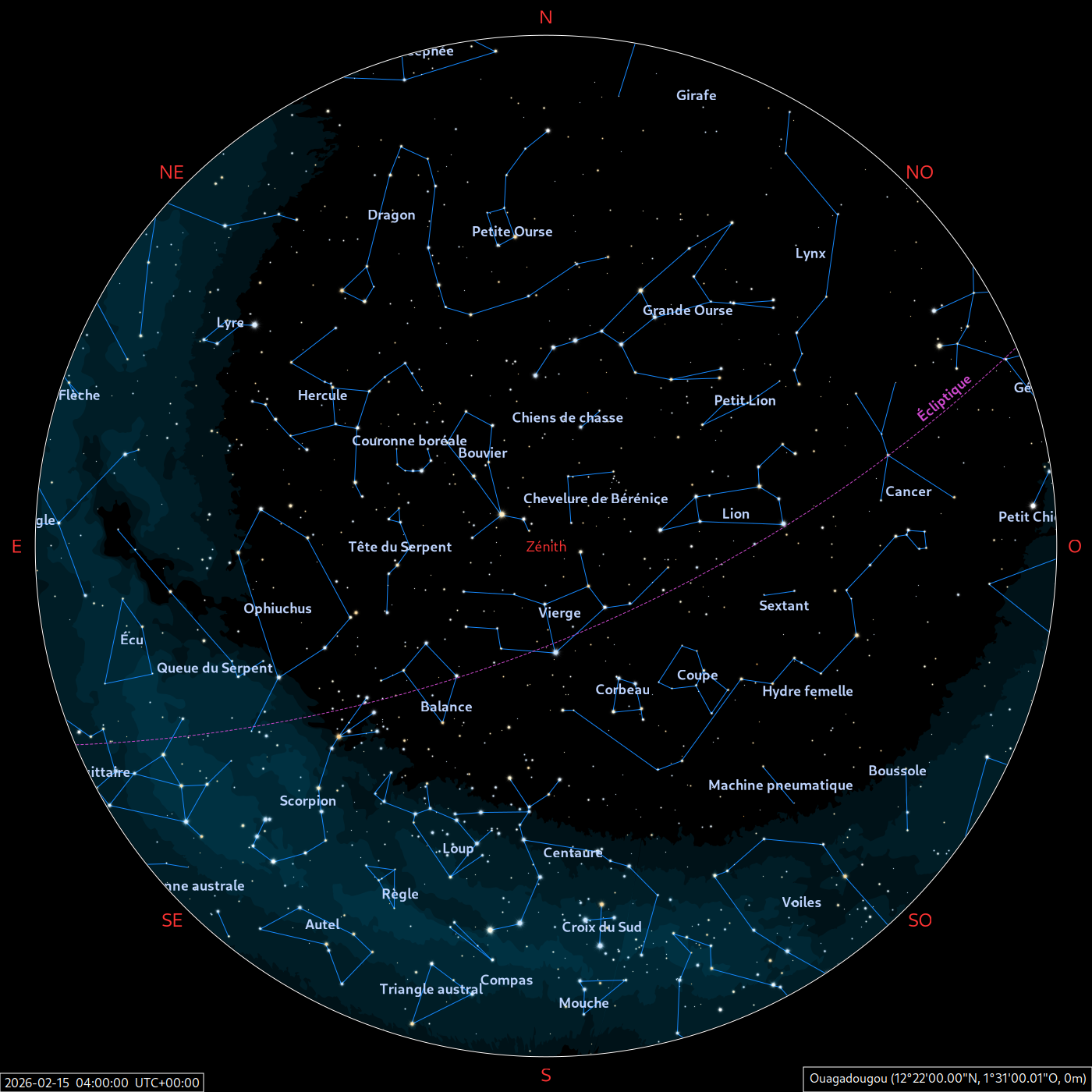 Les cartes du ciel ci-dessous (réalisées par l’IMCCE) montrent le ciel visible à 22h et à 4h du mois indiqué. Elles sont valables dans le tout le pays avec quelques ajustements selon la latitude.