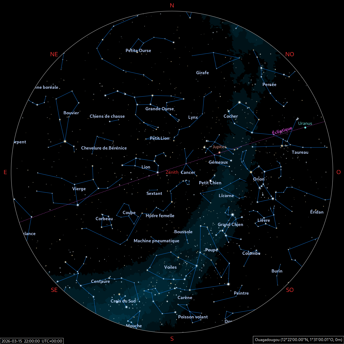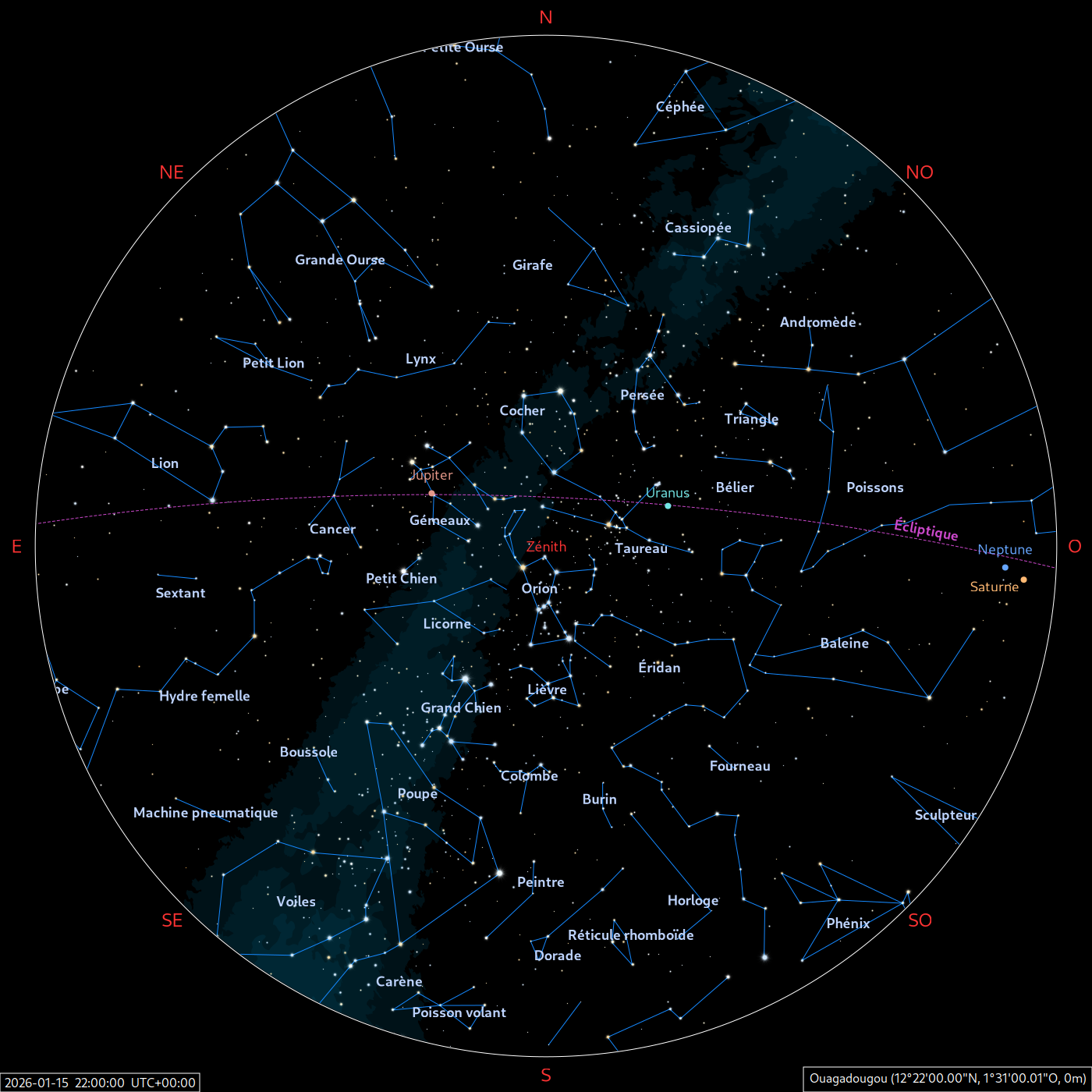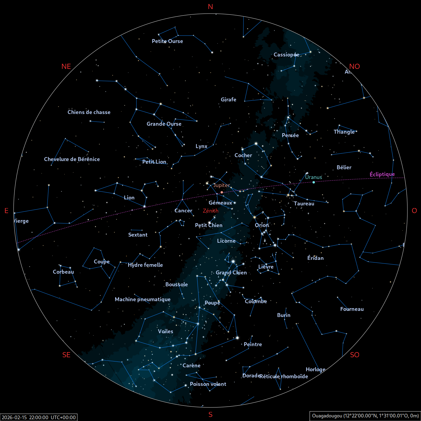 Les cartes du ciel ci-dessous (réalisées par l’IMCCE) montrent le ciel visible à 22h et à 4h du mois indiqué. Elles sont valables dans le tout le pays avec quelques ajustements selon la latitude.