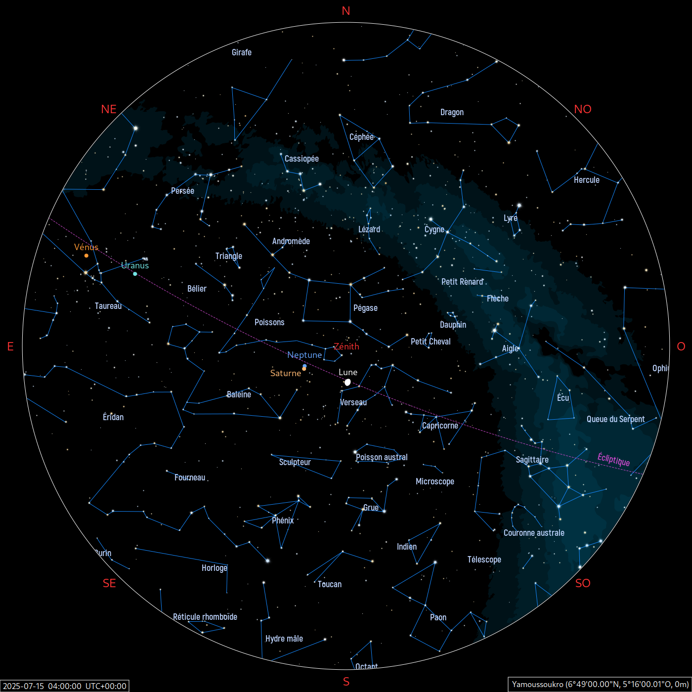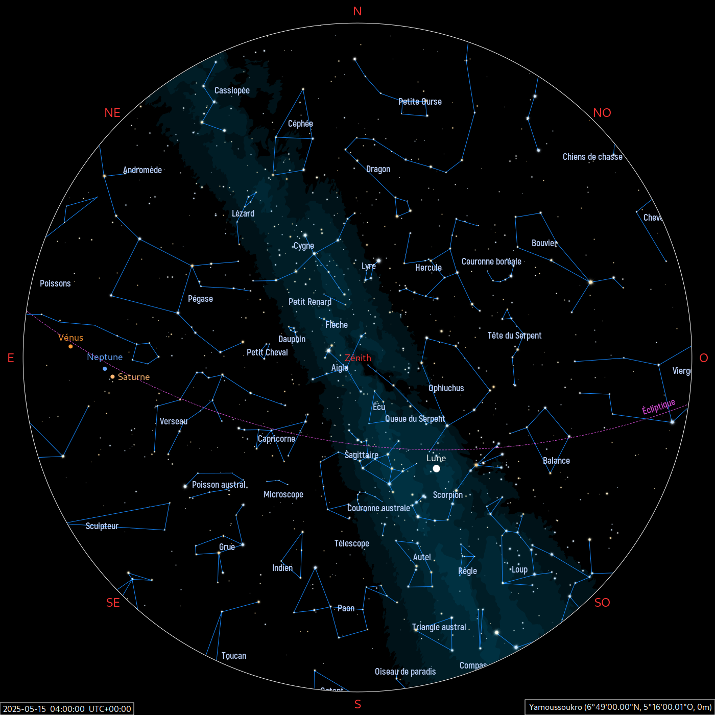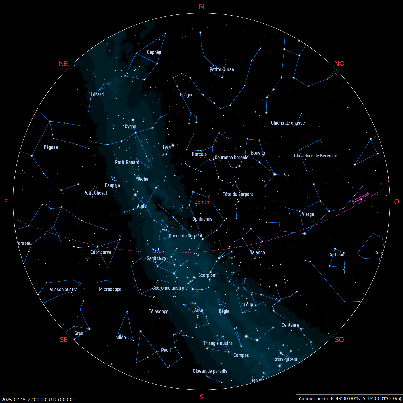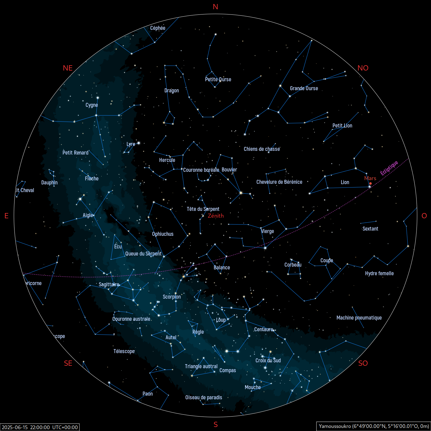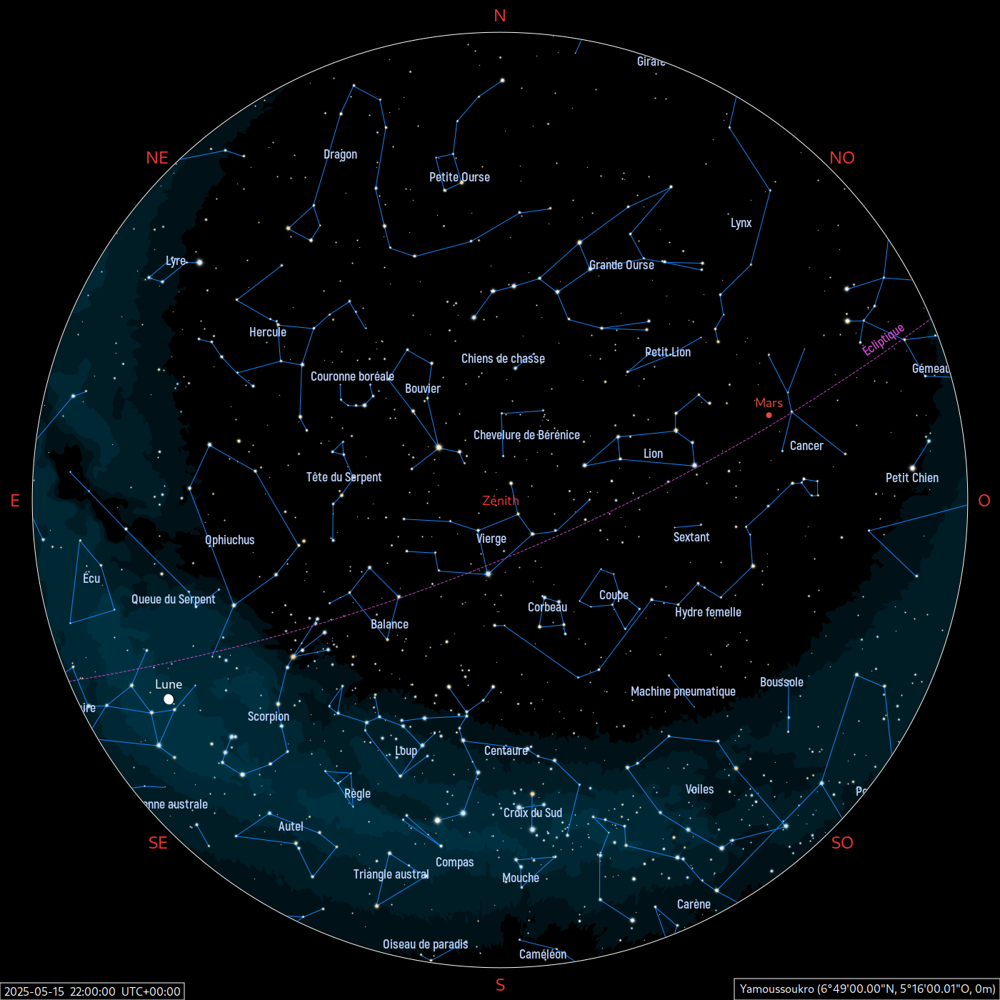 Les cartes du ciel ci-dessous (réalisées par l’IMCCE) montrent le ciel visible à 22h et à 4h du mois indiqué. Elles sont valables dans le tout le pays avec quelques ajustements selon la latitude.