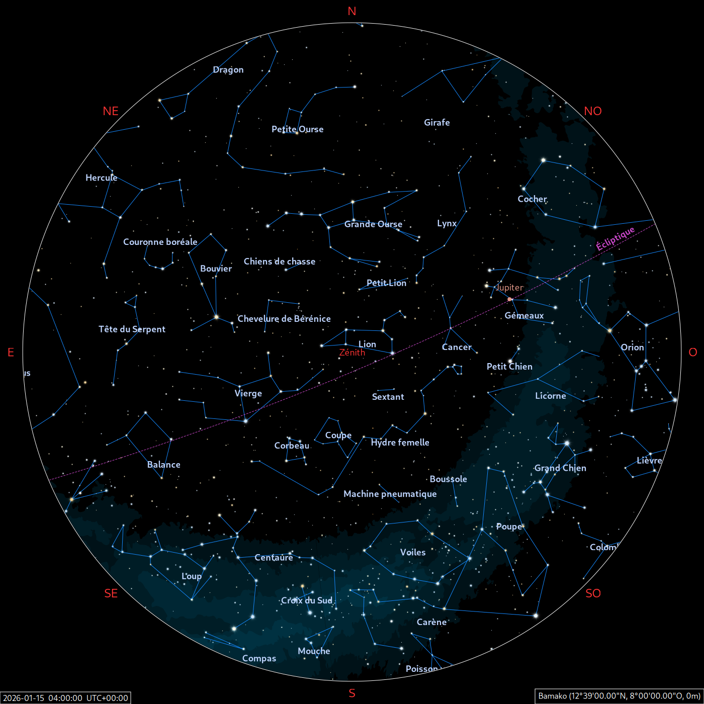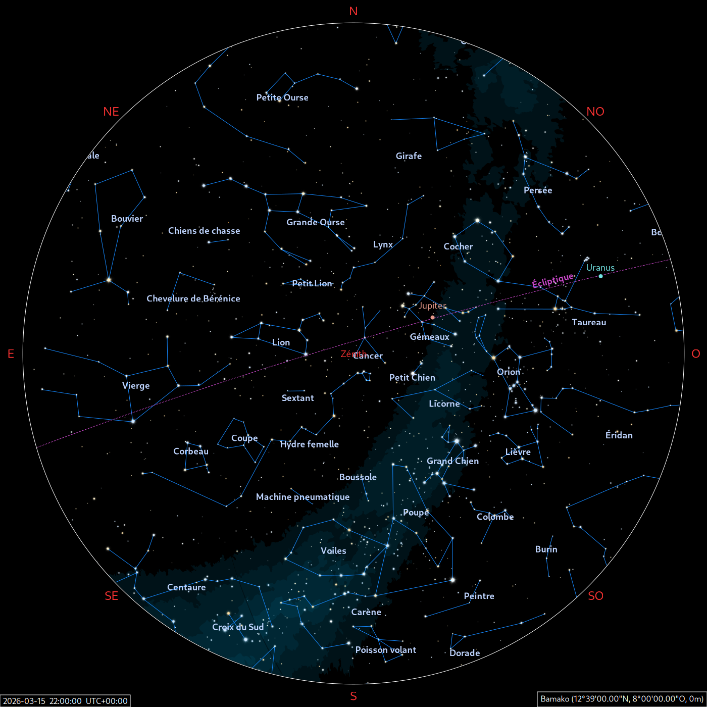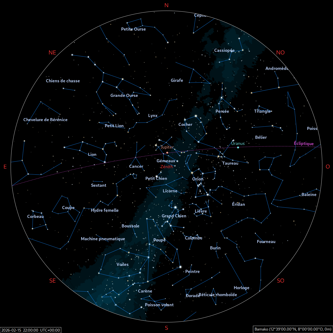 Les cartes du ciel ci-dessous (réalisées par l’IMCCE) montrent le ciel visible à 22h et à 4h du mois indiqué. Elles sont valables dans le tout le pays avec quelques ajustements selon la latitude.