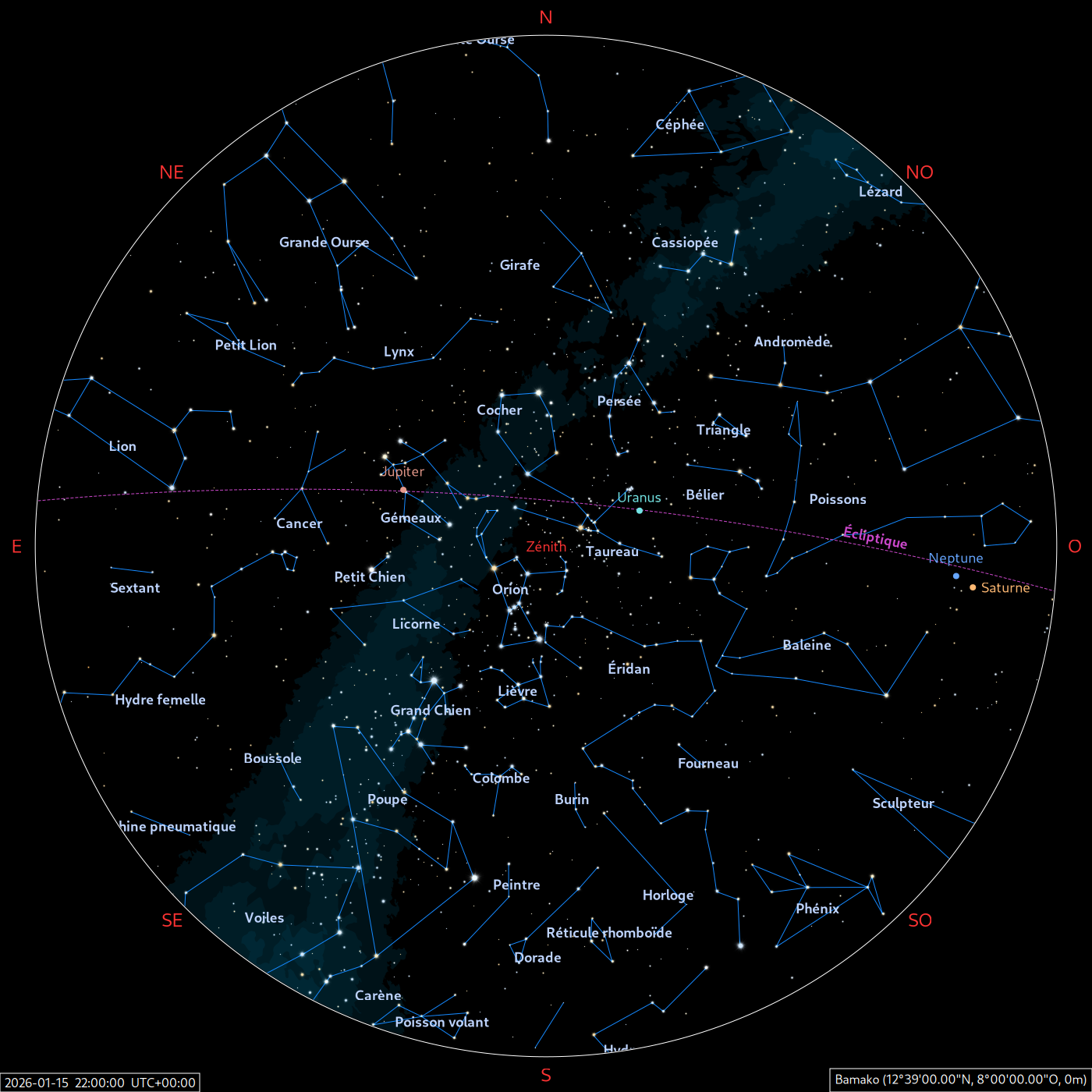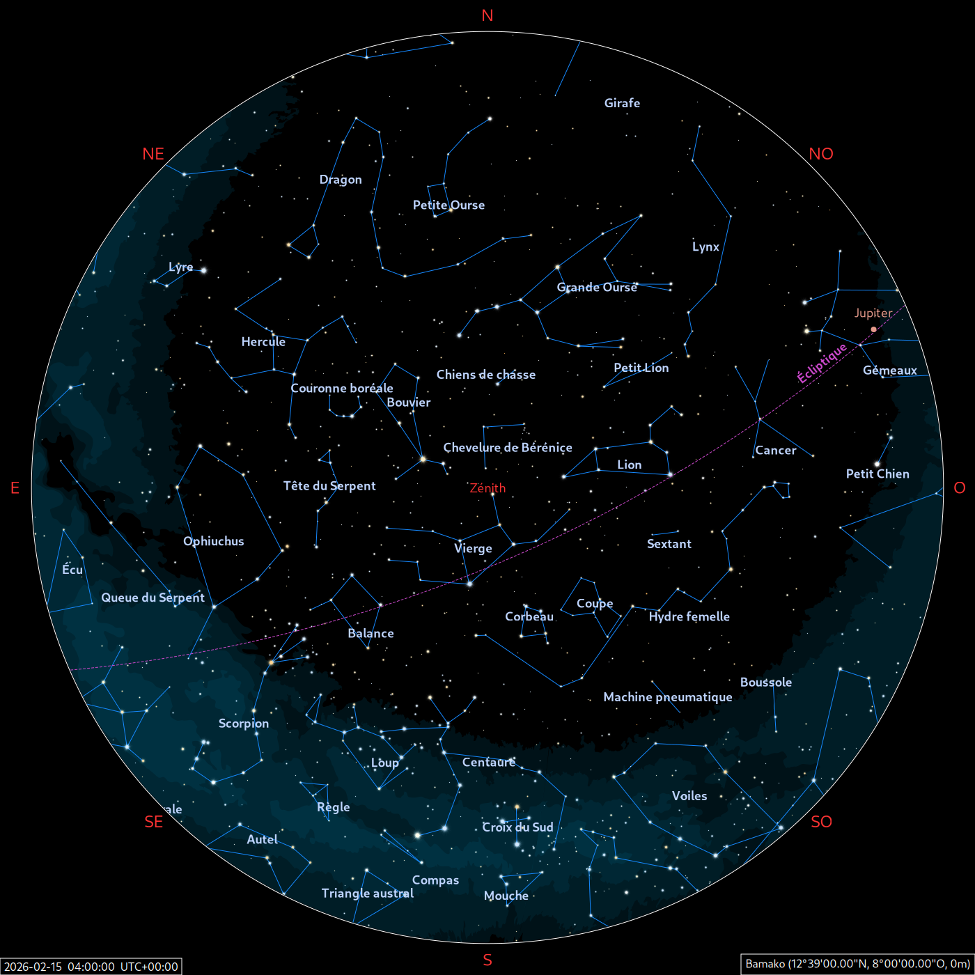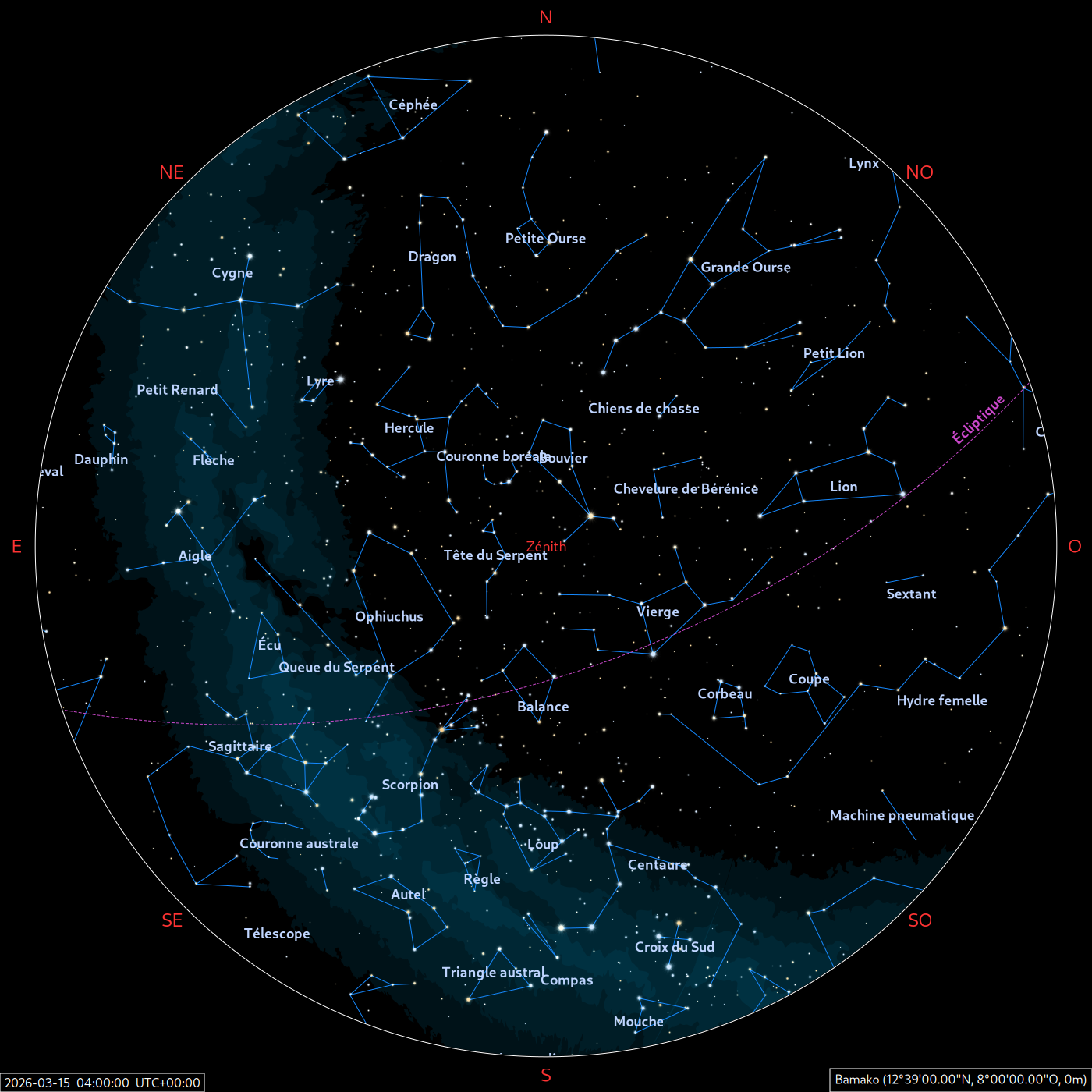 Les cartes du ciel ci-dessous (réalisées par l’IMCCE) montrent le ciel visible à 22h et à 4h du mois indiqué. Elles sont valables dans le tout le pays avec quelques ajustements selon la latitude.