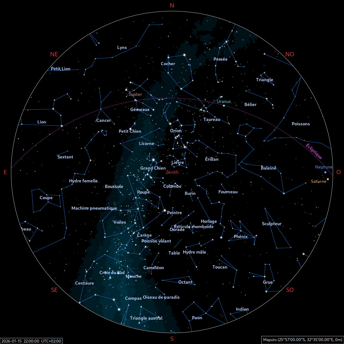 Les éphémérides (en Temps Universel) à télécharger ci-dessous sont réalisées par l’Institut de Mécanique Céleste et du Calcul des Ephémérides (IMCCE – Lucie Maquet). Elles indiquent les éphémérides des planètes (heure du lever, passage au méridien et coucher), du Soleil (heure du lever, passage au méridien et coucher) et de la Lune (heure du lever, coucher et phase) ainsi que l’interêt et la période d’observation des planètes.