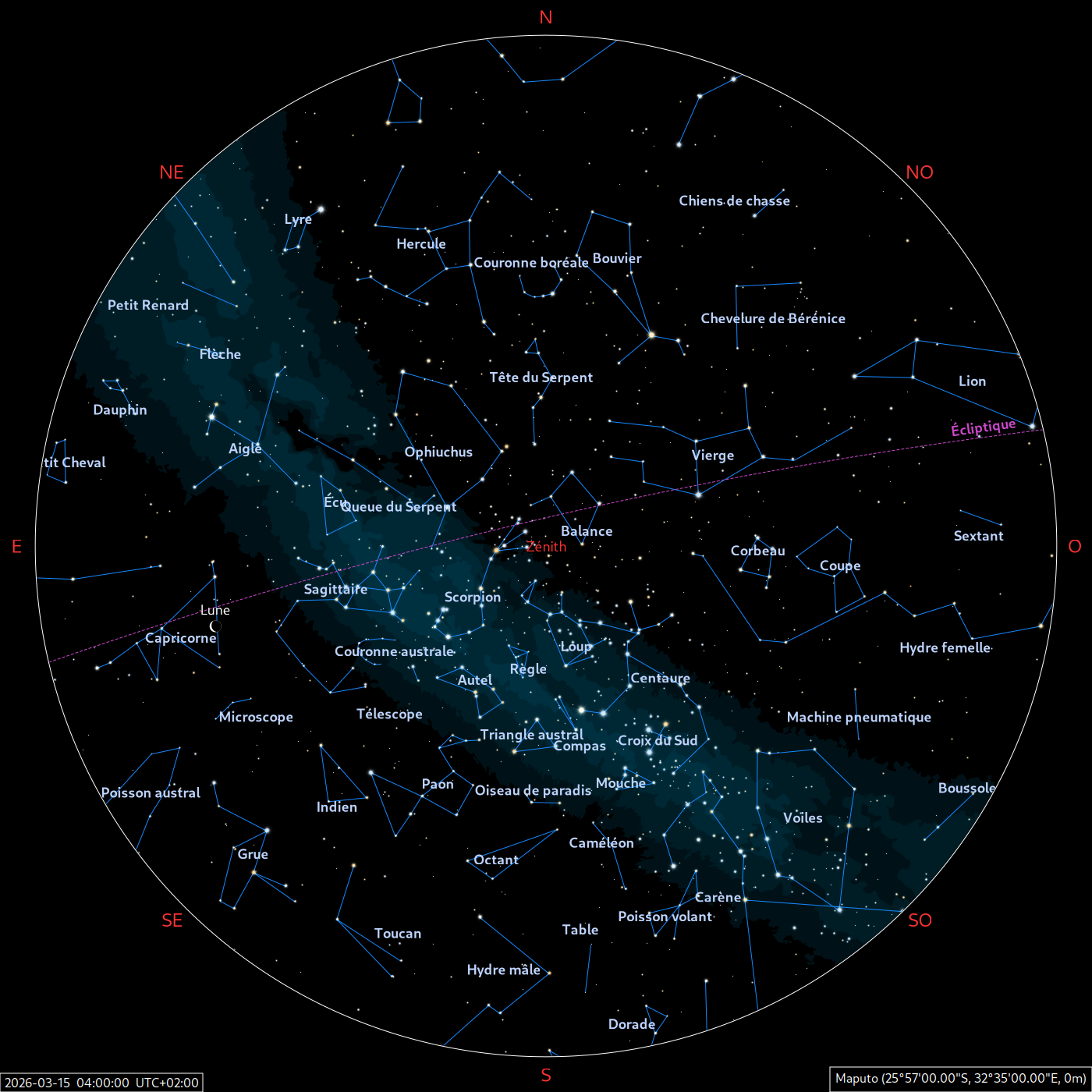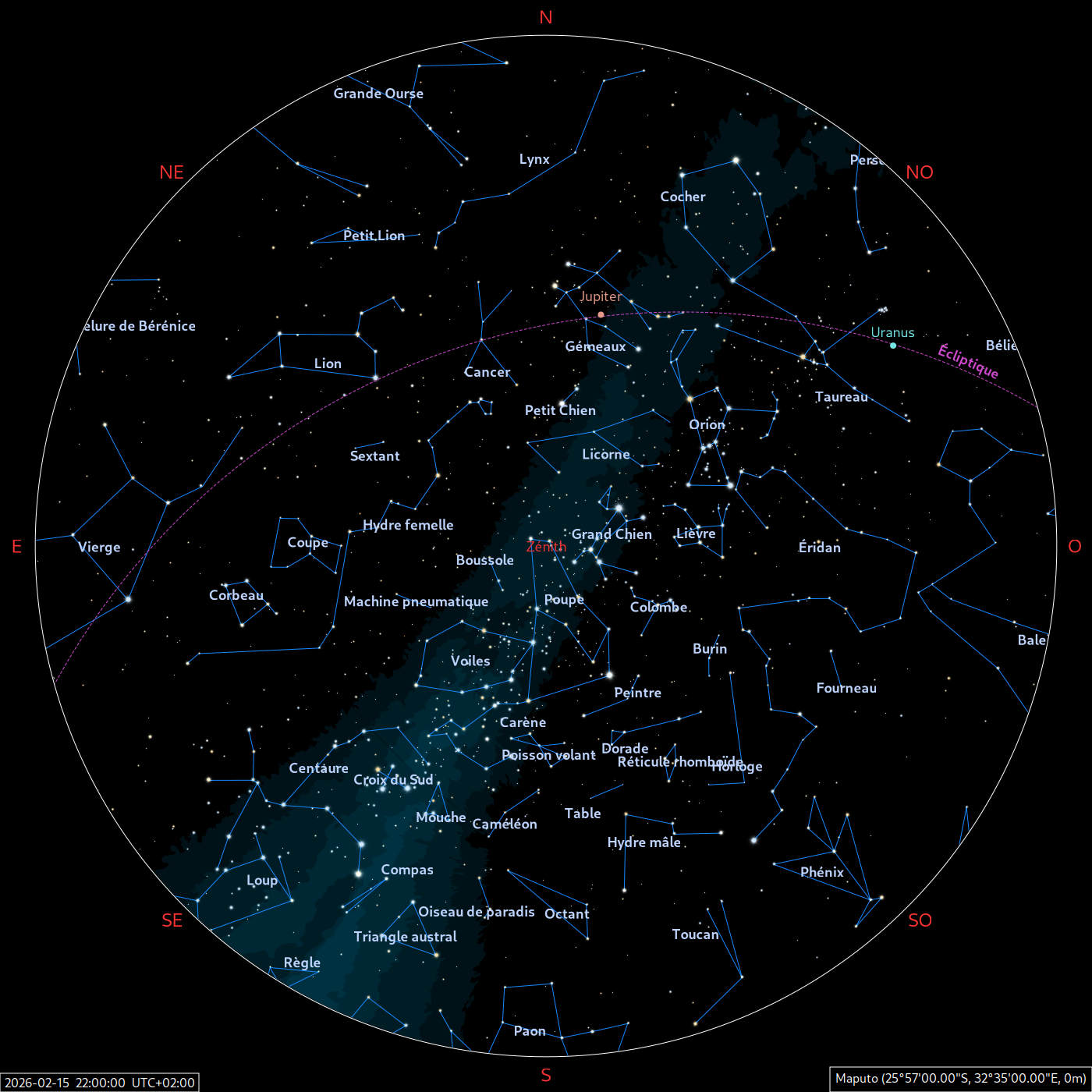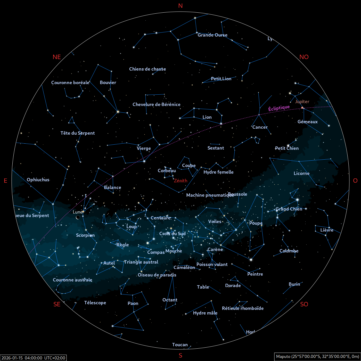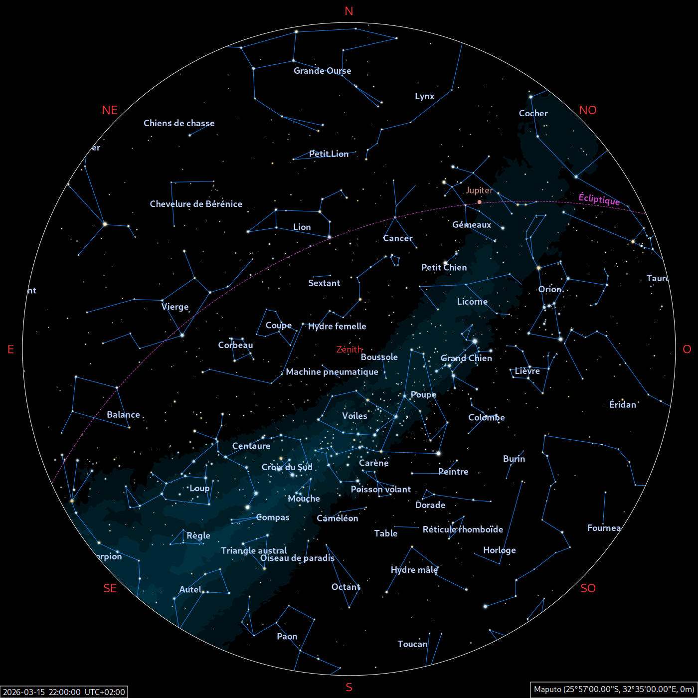 Les cartes du ciel ci-dessous (réalisées par l’IMCCE) montrent le ciel visible à 22h et à 4h du mois indiqué. Elles sont valables dans le tout le pays avec quelques ajustements selon la latitude.