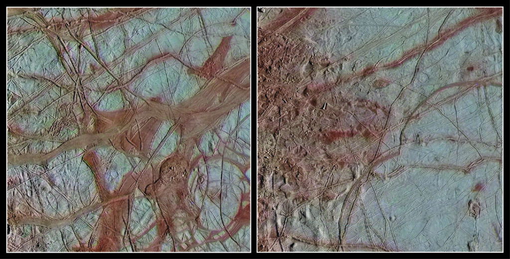 Fig 1. Les terrains chaotiques d’Europe. Ces régions se caractérisent par la présence de nombreuses structures telles que des crêtes, des fossés, des petits dômes, etc., dont l’origine n’est pas encore comprise. Comme le reste de la surface d’Europe, elles témoignent cependant d’une activité tectonique intense et récente, l’âge de la surface d’Europe étant estimé entre 40 et 90 millions d’années. (Crédit : NASA/JPL-Caltech/SETI Institute)