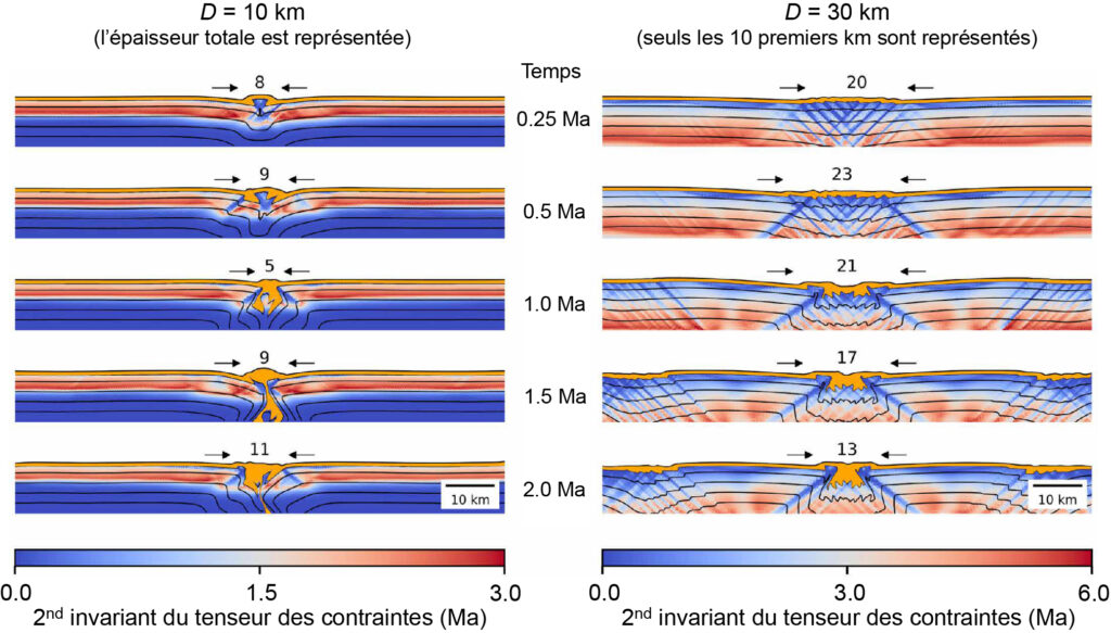 Fig 2. Simulations numériques modélisant l’évolution d’une couche de glace soumise à des forces de compression horizontales. Le code de couleur représente le 2d invariant du tenseur des contraintes, qui est une mesure de l’amplitude de ces contraintes. En réponse à une compression, des systèmes de failles se forment dans la couche de glace. Si la couche de glace est relativement épaisse, plus de 10 km (colonne de droite ; à noter que sur cette image l’épaisseur totale est tronquée), plusieurs systèmes de failles apparaissent au centre et sur les bords. La glace de surface (fine couche orange) glisse vers ces régions et s’y accumule, mais la déformation n’est pas suffisante pour enclencher un phénomène de subduction. En revanche si la couche de glace est plus fine (à gauche) une seule paire de failles apparaît (au centre). La déformation de la couche de glace se concentre autour de ce système, ce qui permet à la glace de surface de glisser vers cette région, de s’y accumuler et, à terme, de descendre jusqu’à la base de la couche de glace par subduction. Les flèches noires délimitent les zones de compression, la largeur de ces zones (en km) étant indiquée par le nombre inséré entre ces flèches. (Crédit : M. Kihoulou et al., 2025)