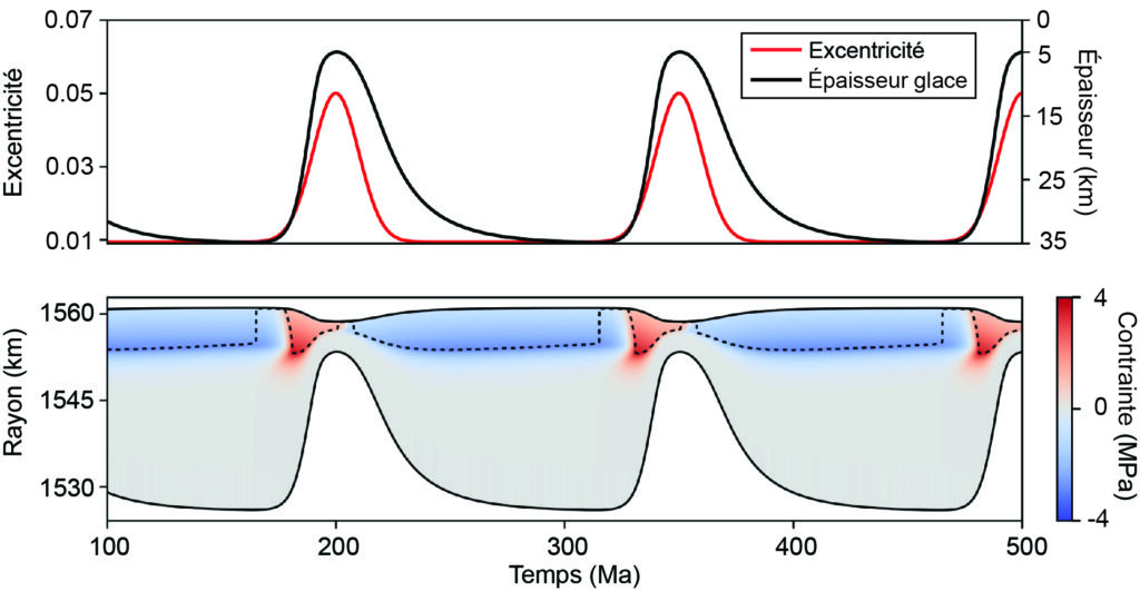 Fig 3. Évolution de l’excentricité et de l’épaisseur de la couche de glace (en haut) et des contraintes latérales dans cette couche (en bas ; code de couleur). Les forces de compression et d’extension apparaissent respectivement en rouge et en bleu. La figure du bas représente également l’évolution du rayon total d’Europe et du rayon de la base de la couche de glace. (Crédit : M. Kihoulou et al., 2025)