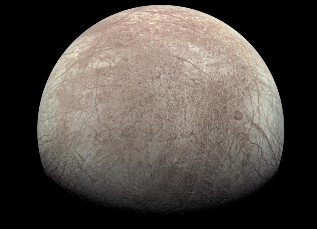 Europe vue par la sonde spatiale Juno lors d’un survol effectué le 29 septembre 2022. (Crédit : NASA/JPL/SwRI/MSSS, traitement d’image : Kevin M. Gill)