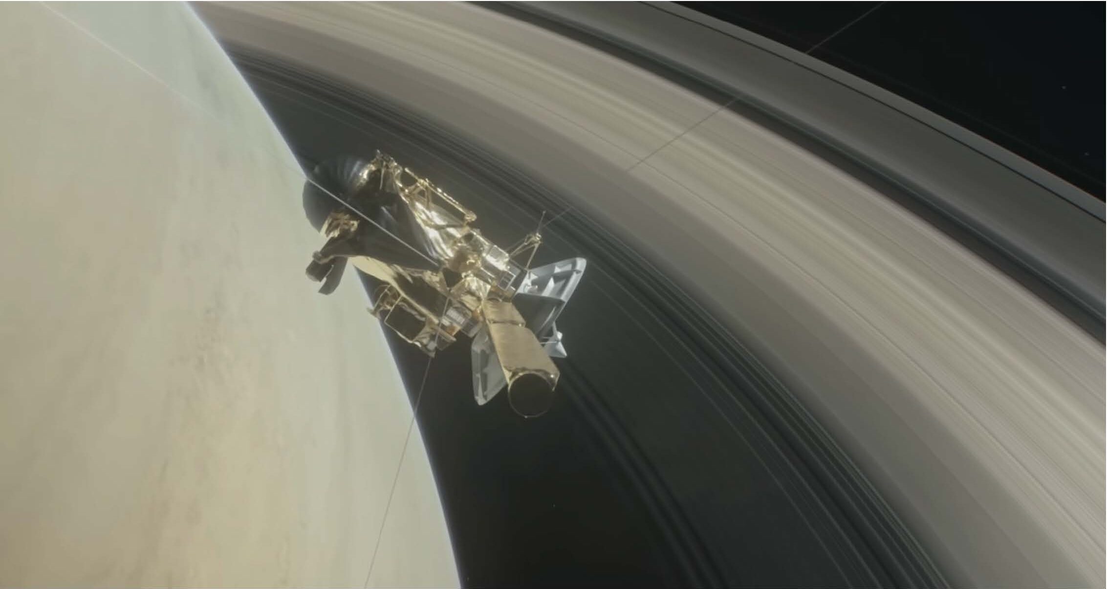 Fig 1. Représentation d’artiste de l’orbiteur de Cassini vu entre la planète Saturne et ses plus proches anneaux, durant le « Grand Finale » (2017). (Crédit : NASA)