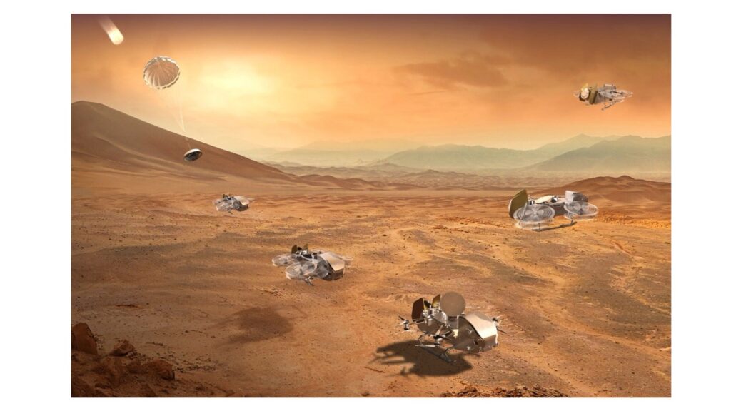 Fig 2. Représentation d’artiste de la descente (sous parachute) de l’aérobot Dragonfly (à gauche) puis de son envol pour une campagne d’observations (à droite). (Crédit : NASA/E. Z. Turtle)