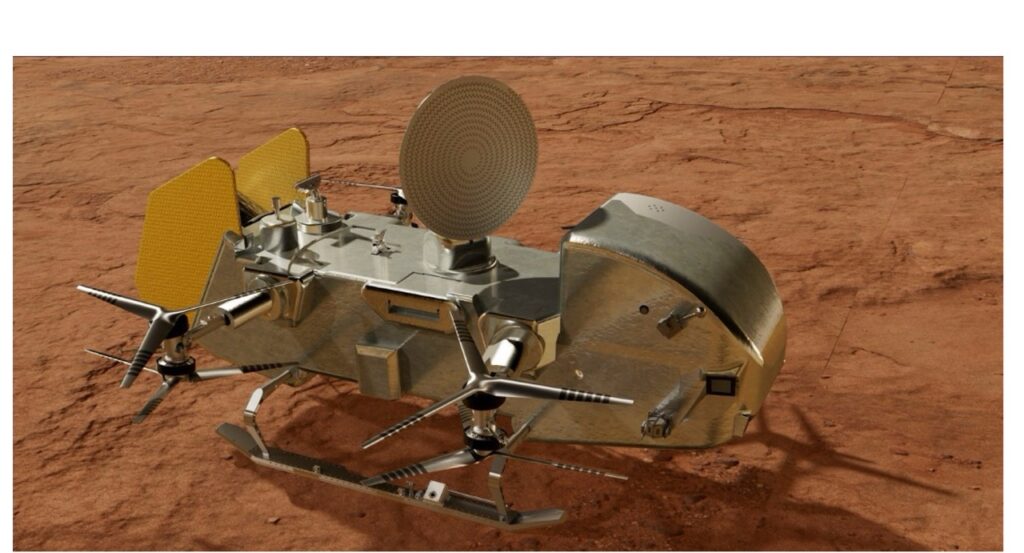 Fig 3. L’aérobot Dragonfly (représentation d’artiste). L’énergie est fournie par des RTG (générateurs thermoélectriques à radio-isotopes). On voit les quatre systèmes d’hélices et, sur l’aérobot, la grande antenne qui communique avec la Terre. (Crédit : NASA/E. Z. Turtle)