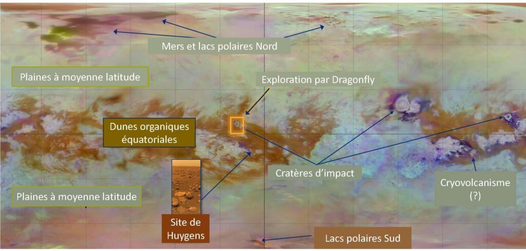 Fig 4. Carte de la surface de Titan réalisée à partir des images prises par les instruments VIMS et SSI de Cassini dans l’infrarouge proche. Les sites d’atterrissage de Huygens et de Dragonfly y sont représentés. (Crédit : B. Seignovert et al., LPSC Conference, abstract 1423.pdf, 2019)