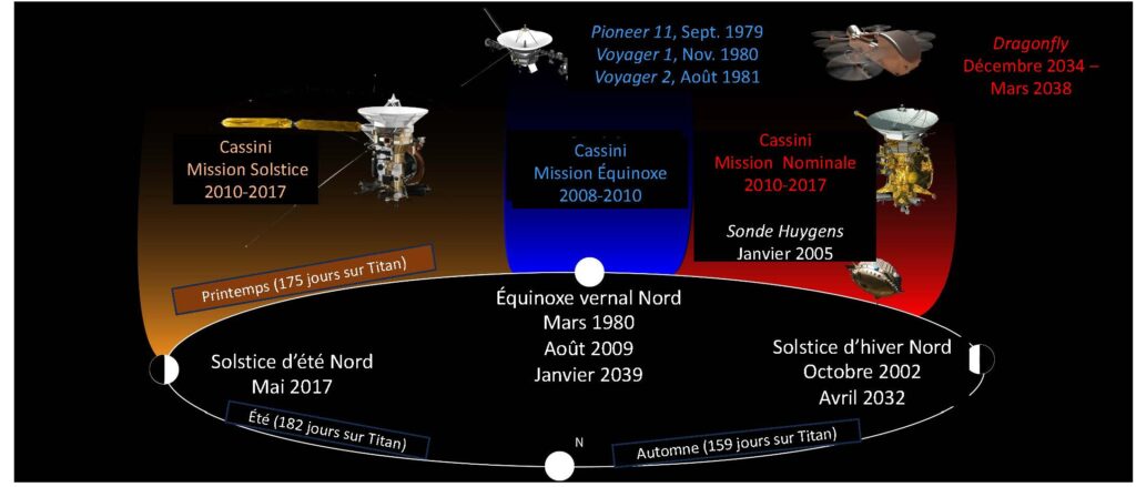 Fig 5. L’orbite de Saturne autour du Soleil et le positionnement des missions spatiales en fonction du cycle saisonnier. Comme Titan est en orbite synchrone autour de Saturne, le cycle saisonnier de Titan reflète celui de Saturne. L’arrivée de Dragonfly en 2034 devrait coïncider avec l’hiver boréal de Titan, comme c’était le cas trente ans plus tôt pour l’arrivée de Cassini-Huygens. (Crédit : NASA)