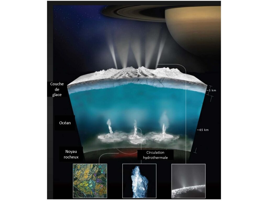 Le défi est de taille. Au cours de ses treize années d’opération, la mission Cassini-Huygens a accumulé les découvertes et les surprises [1]. Conçue et développée à la suite des résultats des missions Voyager qui avaient révélé l’intérêt exceptionnel du satellite Titan – ce nouvel analogue d’une « Terre primitive » –, la mission Cassini-Huygens s’était d’emblée focalisée sur l’analyse approfondie du plus gros satellite de Saturne, en déposant à sa surface la sonde Huygens. De plus, le radar de l’orbiteur Cassini a découvert à la surface de Titan, à haute latitude, de vastes lacs d’hydrocarbures qui évoluent selon le cycle des saisons. Mais une autre découverte encore plus surprenante a défrayé la chronique : dès 2005, les instruments de l’orbiteur Cassini (fig. 1) ont mis en évidence une activité interne au sein du petit satellite Encelade. Il s’est avéré que les plumes (éjections de gaz composées majoritairement de vapeur d’eau) issues du pôle Sud d’Encelade étaient à l’origine de l’anneau E qui entoure Saturne. Les mesures réalisées sur la petite lune tout au long de la mission ont révélé la présence d’un océan liquide composé d’eau et de sels sous la surface du satellite, probablement en contact avec la surface silicatée du satellite. Des sources hydrothermales pourraient-elles y être présentes, comme dans le cas des fosses marines terrestres ? Cette hypothèse a projeté Encelade à la tête des cibles les plus prometteuses en matière d’exobiologie.