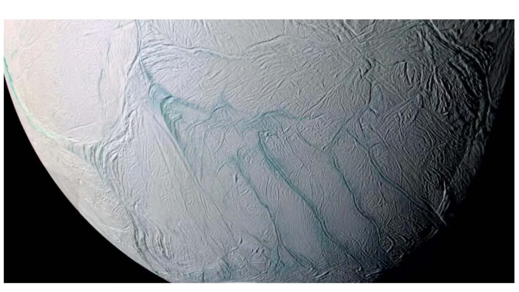 Fig 7. La région active située au pôle Sud d’Encelade, observée par la caméra de Cassini. Elle est caractérisée par de profondes fissures (les tiger stripes ou griffes de tigre) par lesquelles s’échappent les plumes provenant de l’océan d’eau liquide présent sous la surface. La température (91 K, soit –182 °C) est de 10 degrés supérieure à celle de son environnement. (Crédit : NASA)