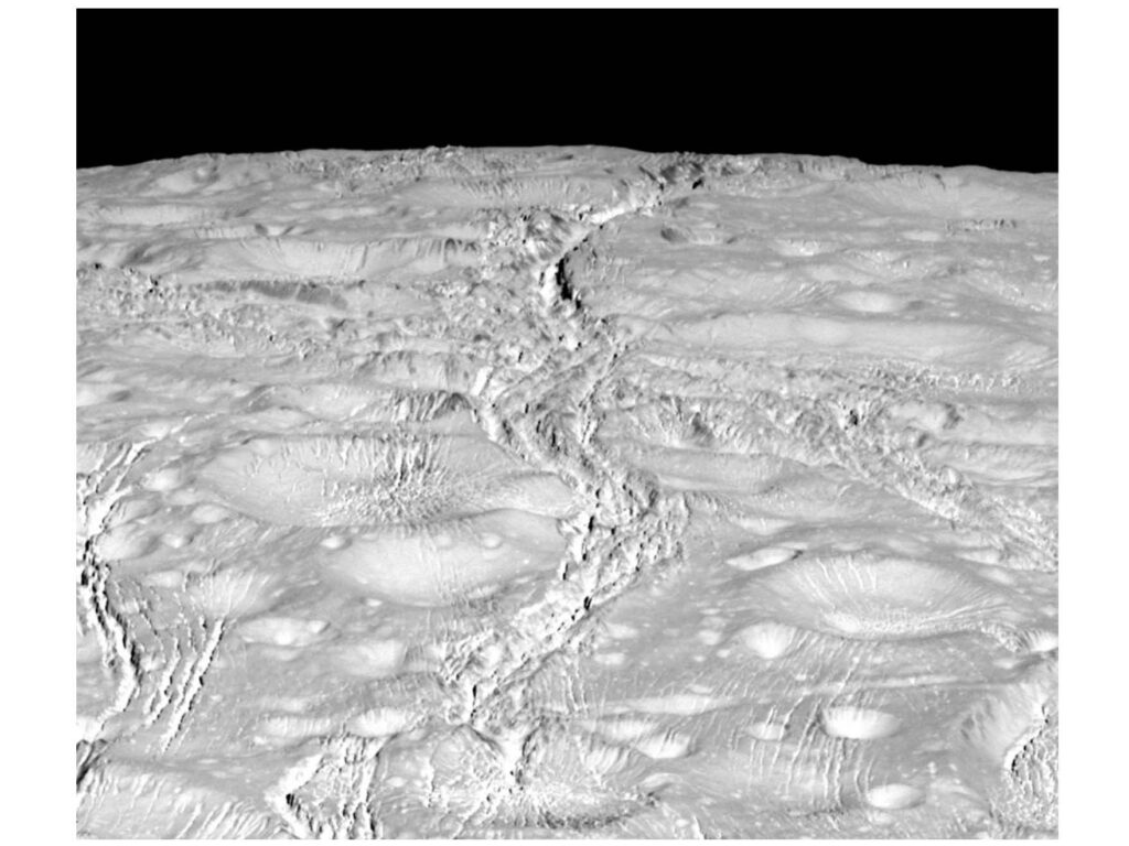 Fig 8. Image de la surface d’Encelade prise par la caméra de l’orbiteur Cassini le 14 octobre 2005. On y voit de multiples cratères traversés par de nombreuses fissures, par lesquelles s’échappent les plumes issues de l’océan interne. Une reconnaissance très précise du sol d’Encelade sera nécessaire pour assurer une dépose sans risque du module de descente de la mission L4. (Crédit : NASA)
