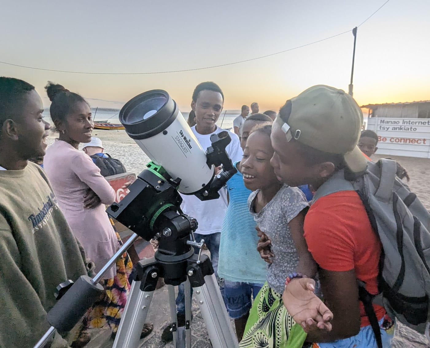 Le 5 juillet, les ateliers jeunesse ont été suivis d’une nouvelle session de conférences grand public consolidant les thématiques abordées la veille. En soirée, l’observation organisée à La Terrasse du Voyageur a permis de toucher un public plus large encore, dans un cadre ouvert et convivial. Suivi du 6 juillet où le festival s’est prolongé sur la plage de Ramena avec une observation du Soleil en fin d’après-midi, suivie d’une observation nocturne. Installer les télescopes face à l’océan, sous le ciel du nord malgache, a offert une image forte : celle d’une science qui sort des salles de conférence pour rejoindre directement les citoyens.